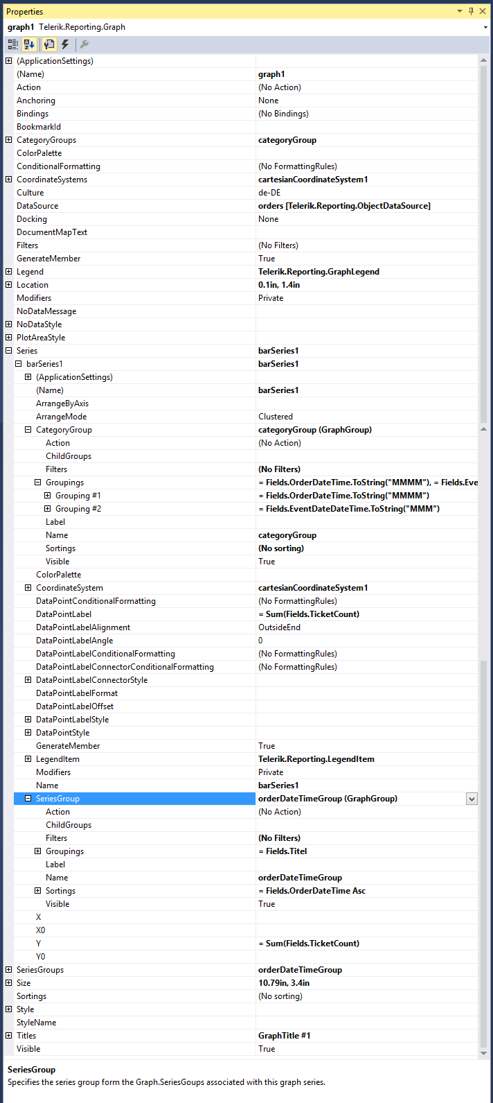 public class Report1Model{ public string Titel { get; set; } public DateTime OrderDateTime { get; set; } public DateTime EventDateDateTime { get; set; } public int TicketCount { get; set; }}The second attached picture chart-properties.png is a screenshot of the properties of my chart.