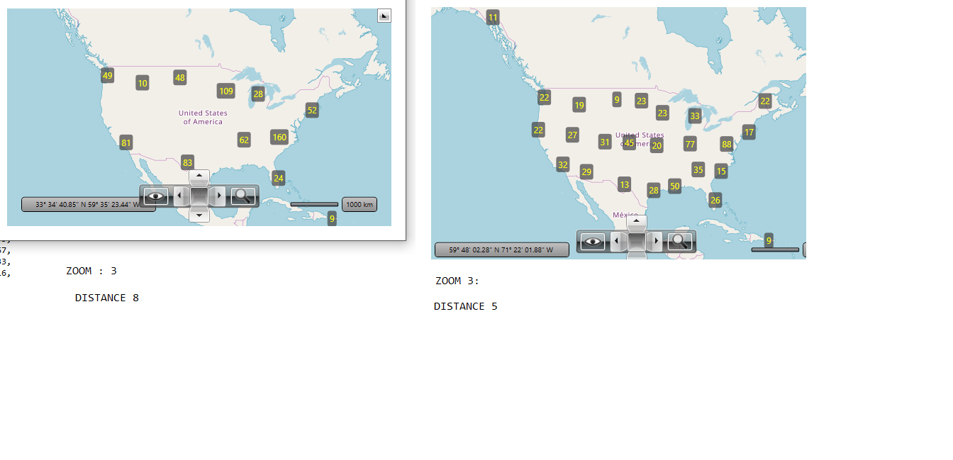 In the attached project, default close distance for zoom level 1 is 20. If you increase it to 200, you will notice there will be single cluster on zoomlevel 1. If you decrease it to 0.02 there will be practically no clusters. You can see the results in the attached pictures. Could you please elaborate a bit more on your scenario and why zoomlevel 1 is problematic. Can you send us some real data (locations) and cluster distances that we can debug locally and double check for an issue in RadMap's internal code. Thank you in advance.