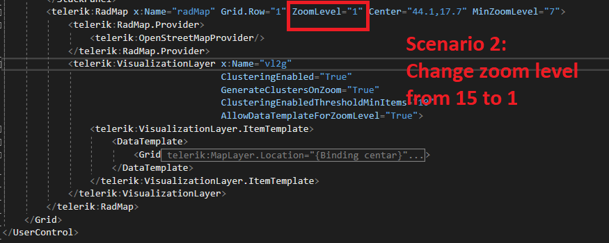 In the attached project, default close distance for zoom level 1 is 20. If you increase it to 200, you will notice there will be single cluster on zoomlevel 1. If you decrease it to 0.02 there will be practically no clusters. You can see the results in the attached pictures. Could you please elaborate a bit more on your scenario and why zoomlevel 1 is problematic. Can you send us some real data (locations) and clsuter distances that we can debug locally and double check for an issue in RadMap's internal code. Thank you in advance.