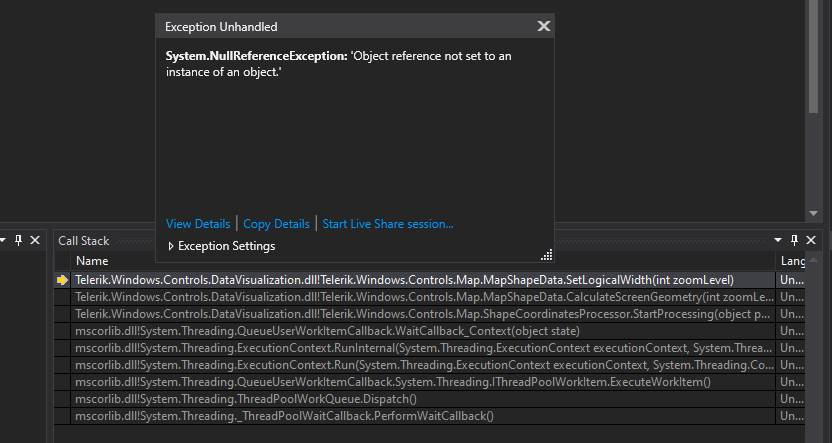 I added the two lines you suggested to the button click event of the sample. Although it seems to work for a bit, I can click the button sometimes and it generates a NullReferenceException which crashes the application. Please see attached image.
