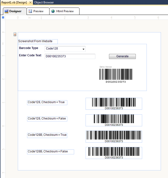 Symbology = Code128 and Checksum = False