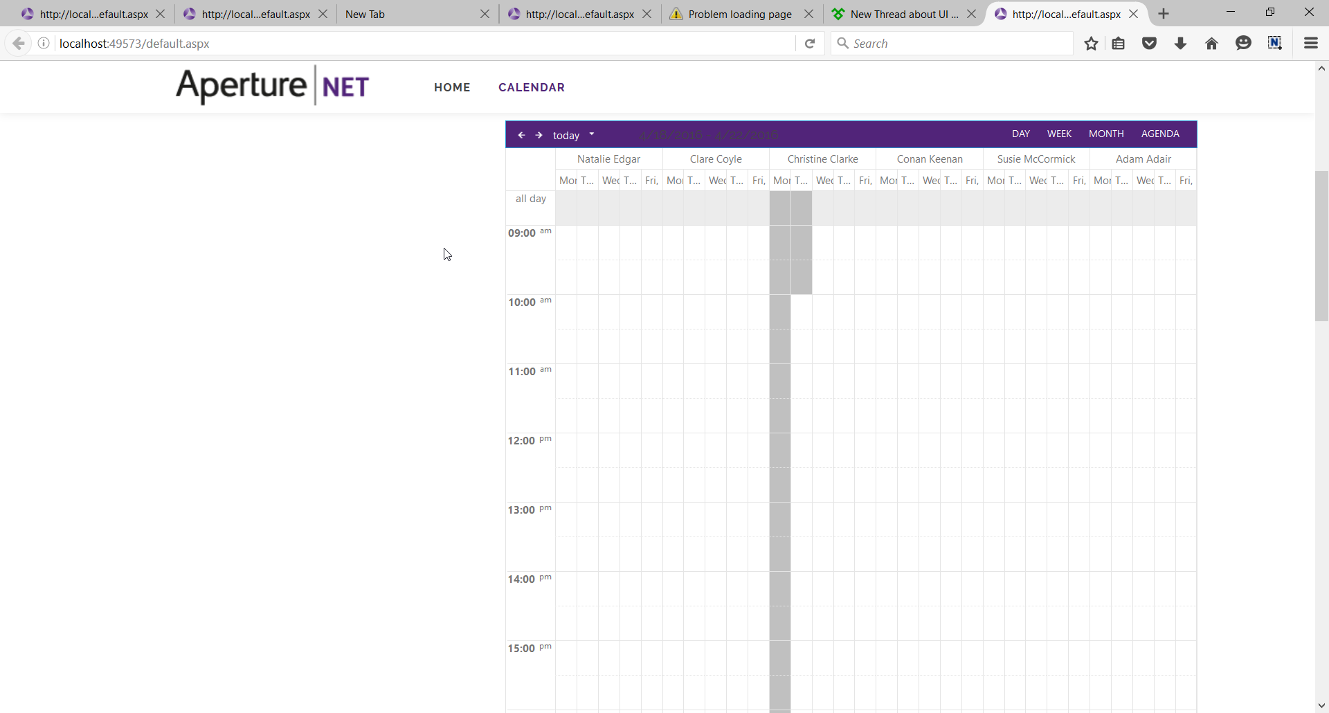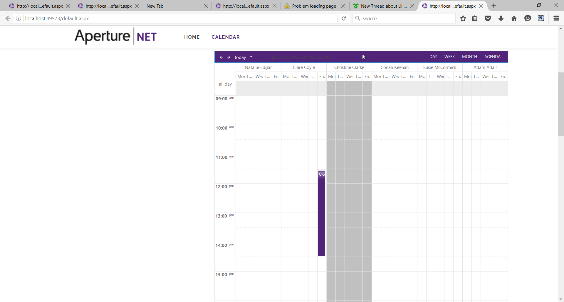 001.protected void apertureAppointments_TimeSlotCreated(object sender, TimeSlotCreatedEventArgs e)002. {003. int i = 0;004. bool isFound = false;005. List<tblApertureNetShiftPattern> _list = new List<tblApertureNetShiftPattern>();006. _list = _dal.getHolidays();007. List<Resource> resources = new List<Resource>(apertureAppointments.Resources.GetResourcesByType("Managers"));008. Label slotlabel = new Label();009. 010. foreach (tblApertureNetShiftPattern sp in _list)011. {012. DateTime dt1 = Convert.ToDateTime(sp.startdate);013. DateTime dt2 = Convert.ToDateTime(sp.endDate);014. 015. 016. if (e.TimeSlot.Start <= dt1 && e.TimeSlot.Resource.Text == sp.manager_name)017. 018. {019. 020. e.TimeSlot.CssClass = "Disabled";021. slotlabel.CssClass = "Disabled";022. 023. }024. 025. if (e.TimeSlot.Start >= dt1 && e.TimeSlot.End <= dt2 && e.TimeSlot.Resource.Text == sp.manager_name)026. {027. 028. if (DoDateRangesOverlap(e.TimeSlot.Start, e.TimeSlot.End, dt1, dt2))029. {030. 031. 032. if(sp.appointmentType ==Constants.shiftsStartOfShift)033. {034. 035. e.TimeSlot.CssClass = "Disabled";036. slotlabel.CssClass = "Disabled";037. 038. }039. 040. if (sp.appointmentType == Constants.shiftStat)041. {042. e.TimeSlot.CssClass = "Disabled";043. slotlabel.CssClass = "Disabled";044. 045. }046. 047. if (sp.appointmentType == Constants.shfitsLunch)048. {049. e.TimeSlot.CssClass = "shiftlunchOff";050. slotlabel.CssClass = "shiftlunchOff";051. if (i == 1)052. {053. slotlabel.Text = "Lunch";054. 055. Image imageControl = new Image();056. // imageControl.ImageUrl = @"~\images\aperturenet\Calendar\resources\holidays.png";057. // e.TimeSlot.Control.Controls.AddAt(1, imageControl);058. 059. }060. }061. if (sp.appointmentType == Constants.shiftDayoff)062. {063. e.TimeSlot.CssClass = "shiftDayOff";064. 065. slotlabel.CssClass = "shiftDayOff";066. 067. if (i == 1)068. {069. slotlabel.Text = "Off test";070. Image imageControl = new Image();071. imageControl.ImageUrl = @"~\images\aperturenet\Calendar\resources\holidays.png";072. e.TimeSlot.Control.Controls.AddAt(1, imageControl);073. }074. }075. else if (sp.appointmentType == Constants.shiftHoliday)076. {077. e.TimeSlot.CssClass = "HolidayCssStyle";078. slotlabel.CssClass = "HolidayCssStyle";079. 080. if (i == 1)081. {082. slotlabel.Text = "Off";083. Image imageControl = new Image();084. imageControl.ImageUrl = @"~\images\aperturenet\Calendar\resources\holidays.png";085. e.TimeSlot.Control.Controls.AddAt(1, imageControl);086. }087. }088. else if (sp.appointmentType == Constants.shiftStat)089. {090. e.TimeSlot.CssClass = "statCssStyle";091. slotlabel.CssClass = "statCssStyle";092. slotlabel.Text = "Off";093. if (i == 1)094. {095. Image imageControl = new Image();096. imageControl.ImageUrl = @"~\images\aperturenet\Calendar\resources\holidays.png";097. e.TimeSlot.Control.Controls.AddAt(1, imageControl);098. }099. }100. else if (sp.appointmentType == Constants.shiftsickDay)101. {102. 103. e.TimeSlot.CssClass = "SickDayStyle";104. slotlabel.CssClass = "SickDayStyle";105. 106. if (i == 1)107. {108. slotlabel.Text = "Sick";109. Image imageControl = new Image();110. imageControl.ImageUrl = @"~\images\aperturenet\Calendar\resources\Sick.png";111. e.TimeSlot.Control.Controls.AddAt(1, imageControl);112. }113. 114. 115. }116. 117. else118. i = i++;119. e.TimeSlot.Control.Controls.AddAt(1, slotlabel);120. dt2 = dt2.AddMinutes(60);121. }122. }123. }124. }
