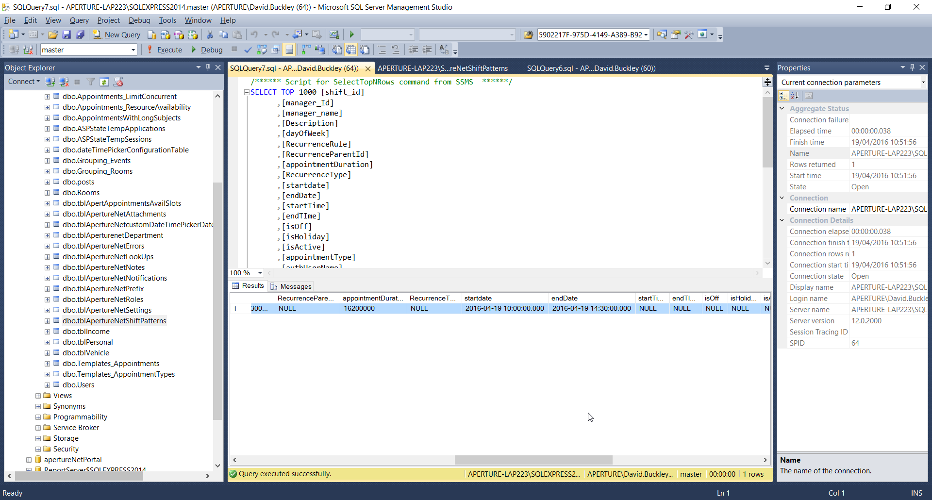 01.public List<tblApertureNetShiftPattern> getHolidays()02.{03. List<tblApertureNetShiftPattern> list = new List<tblApertureNetShiftPattern>();04. 05. var q = from _holidays in apertureNetEntities.tblApertureNetShiftPatterns.Where(w => w.isDeleted == false)06. select _holidays;07. 08. list = q.ToList();09. 10. return list;11.}But as you can see from the second screen shot its filling out every timeslot before that time not just the 9 am to 11 am as it should be in realtion to the database I only use the appointment end type where the appointment type equals a sepcified guid.