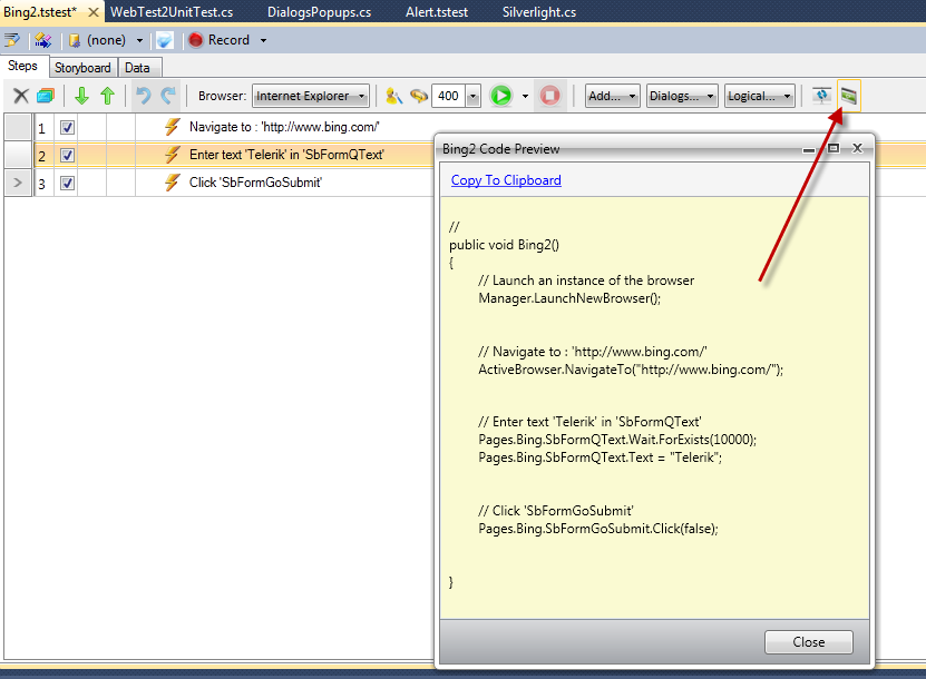 Load your project in Visual Studio. With a test open, click the Preview Code button (see attached screen shot).