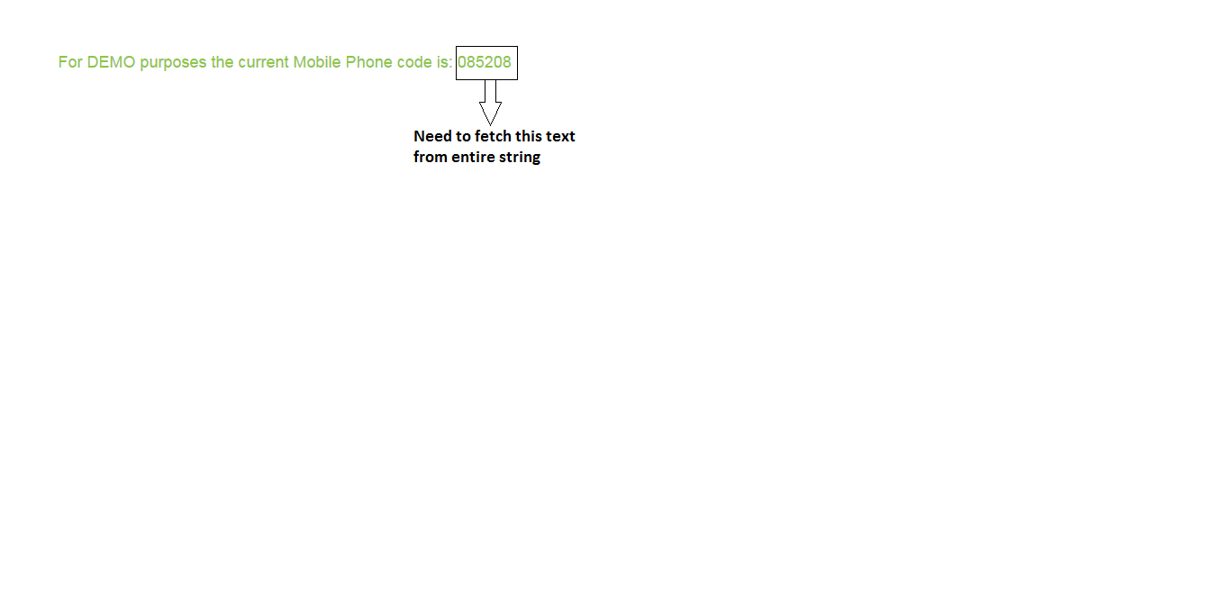 string code = "For DEMO purposes the current Mobile Phone code is: 085208";string newcode = code.Substring(code.Length - 6);Log.WriteLine(newcode);Please note that extracting from string is a general programming problem not related to Test Studio at all. Next time when you have a similar task you can look in MSDN or any other public resource on how to achieve it.