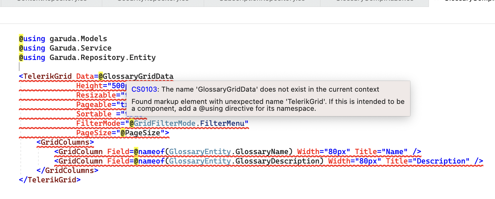 Warning Message : "Found markup element with unexpected name "TelerikGrid". If this is intended to be a component, add a using directive for its namespace"
