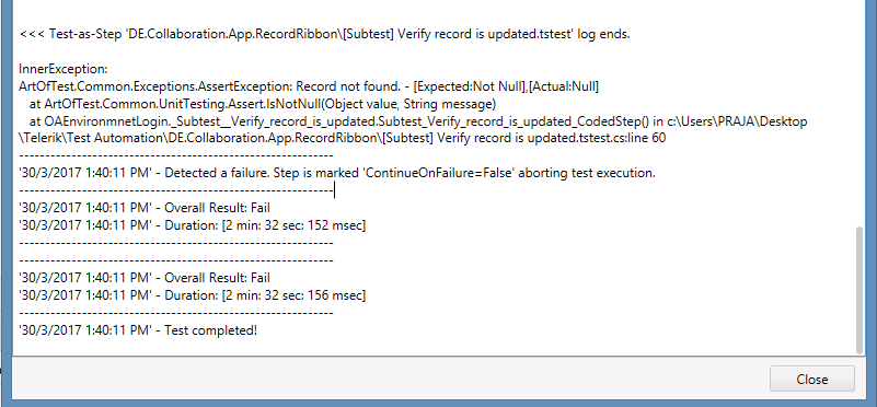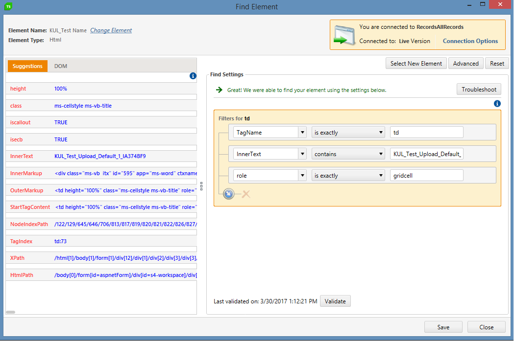 But every time i run the script, my Assert fails (ElementLog.PNG) which is weird because as you can see in (Element.PNG), the same attributes can be detected by Telerik if i recorded and use "Edit Element" option.