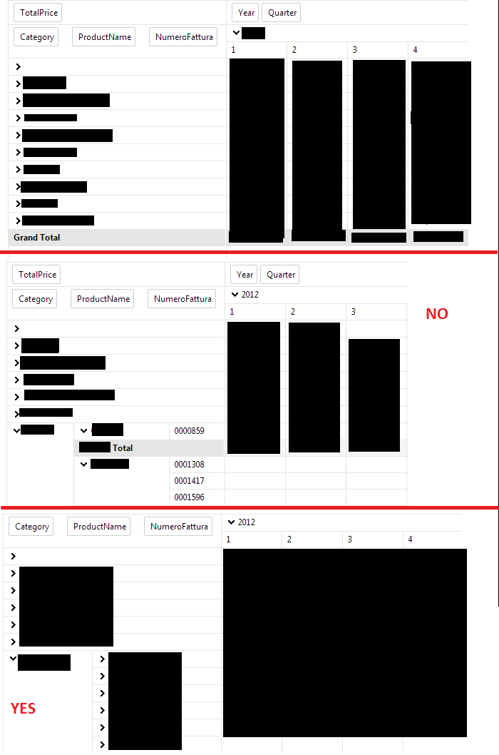 Protected Sub RadPivotGridPayments_NeedDataSource(sender As Object, e As PivotGridNeedDataSourceEventArgs) Handles RadPivotGridPayments.NeedDataSource Dim dt As New DataTable dt = ExpensesDataTable() RadPivotGridPayments.DataSource = dtEnd SubOn a toolbar click, I show a pivotgrid, rebind it and use the code provided by Radoslav: