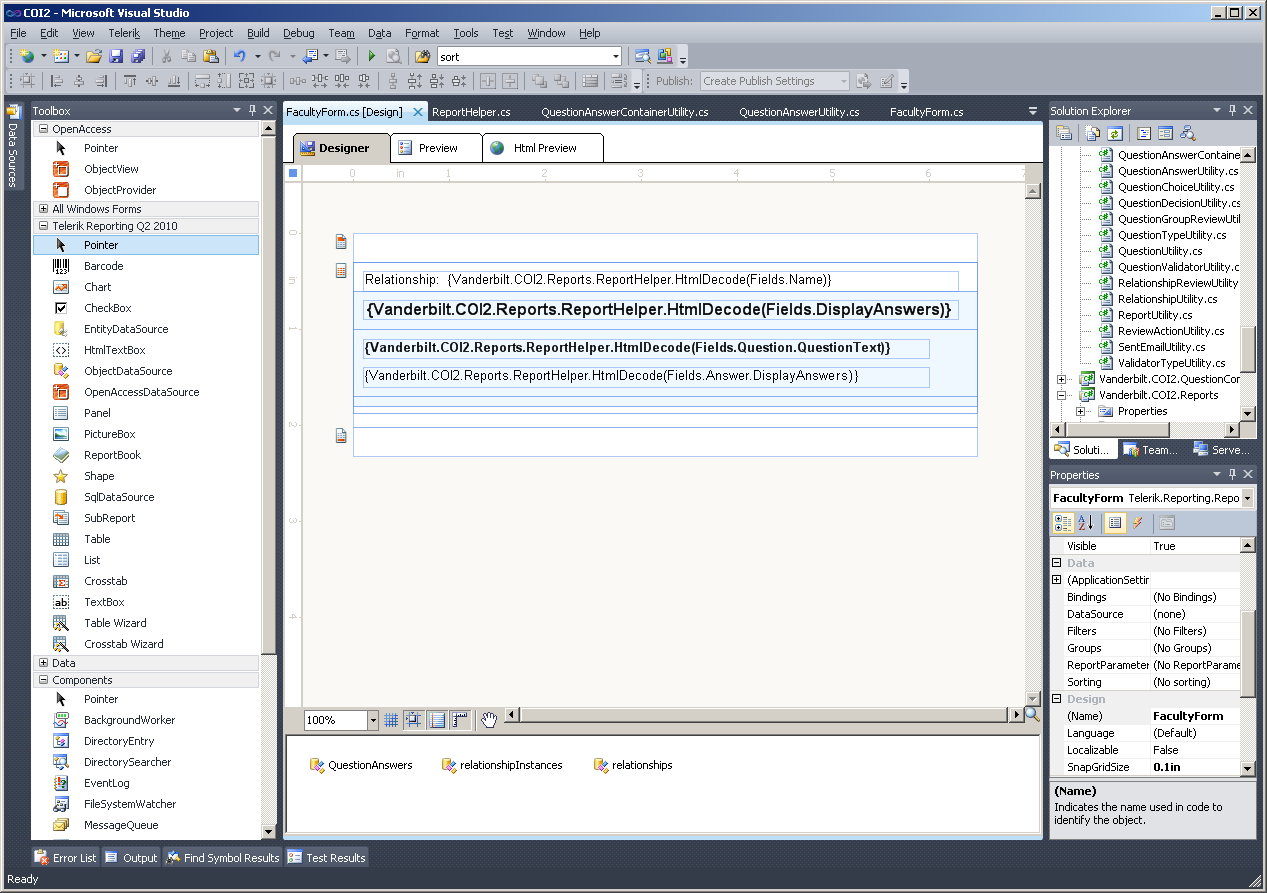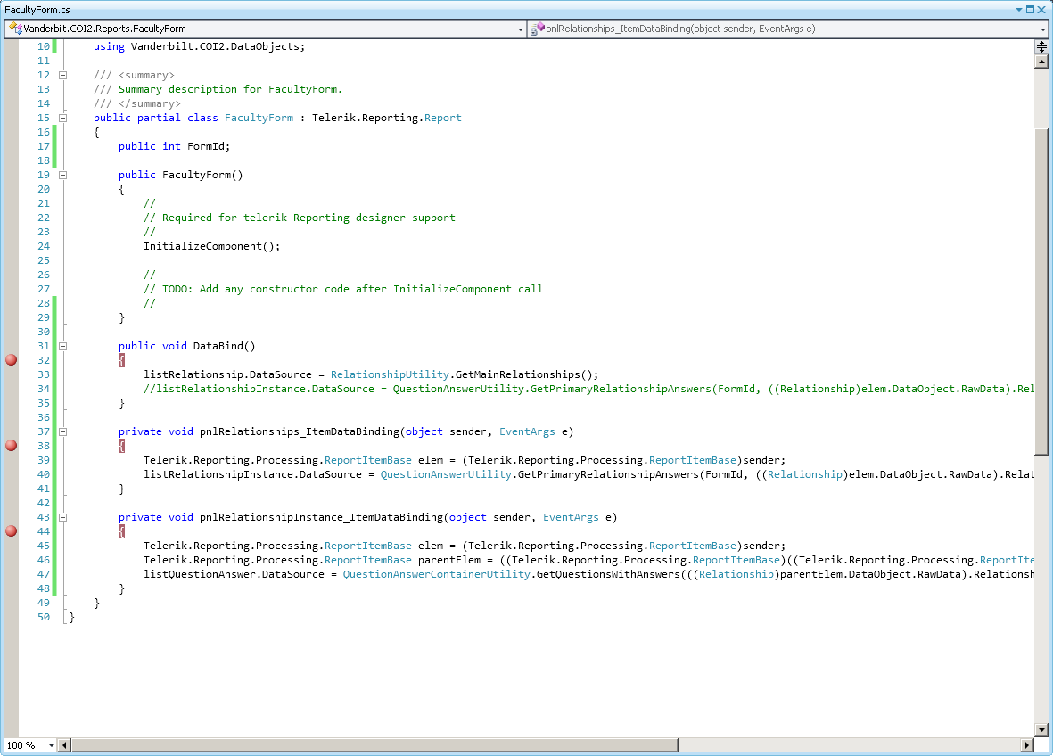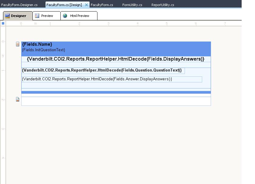 public FacultyForm(){ // // Required for telerik Reporting designer support // InitializeComponent(); // // TODO: Add any constructor code after InitializeComponent call // pnlRelationships.Height = Unit.Inch(0); pnlRelationshipInstance.Height = Unit.Inch(0); detail.Height = Unit.Inch(0); pnlQuestionAnswers.Height = Unit.Inch(0); listQuestionAnswer.Height = Unit.Inch(0); listRelationship.Height = Unit.Inch(0); listRelationshipInstance.Height = Unit.Inch(0);}0