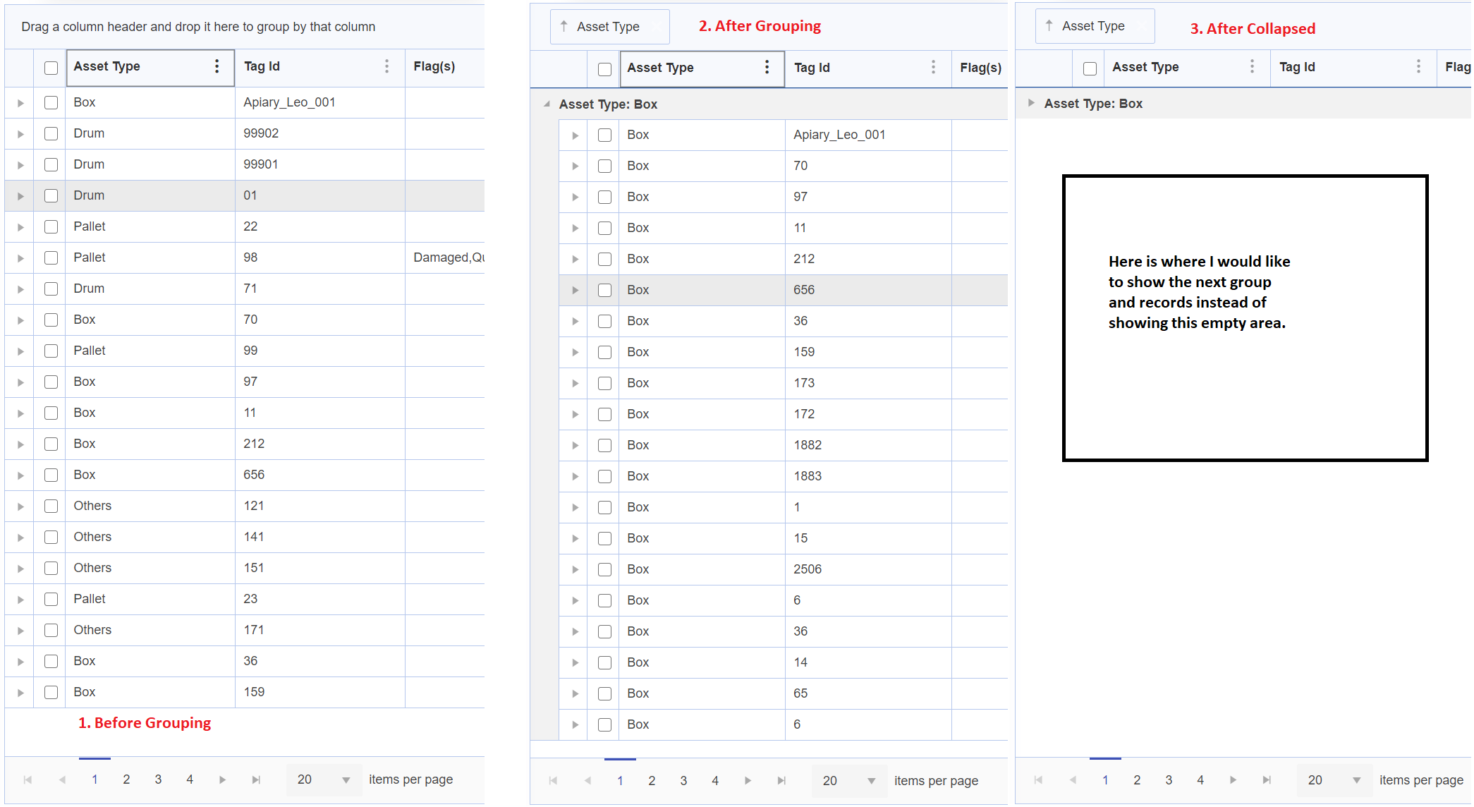 When the user creates a group, it will show only the 20 records for the group. But, I expect that when the user collapses the group, it brings the next group and shows the next 20 records from the next group. Is this possible? Nowadays, it just collapses the current group and leaves an empty space. See the picture attached.