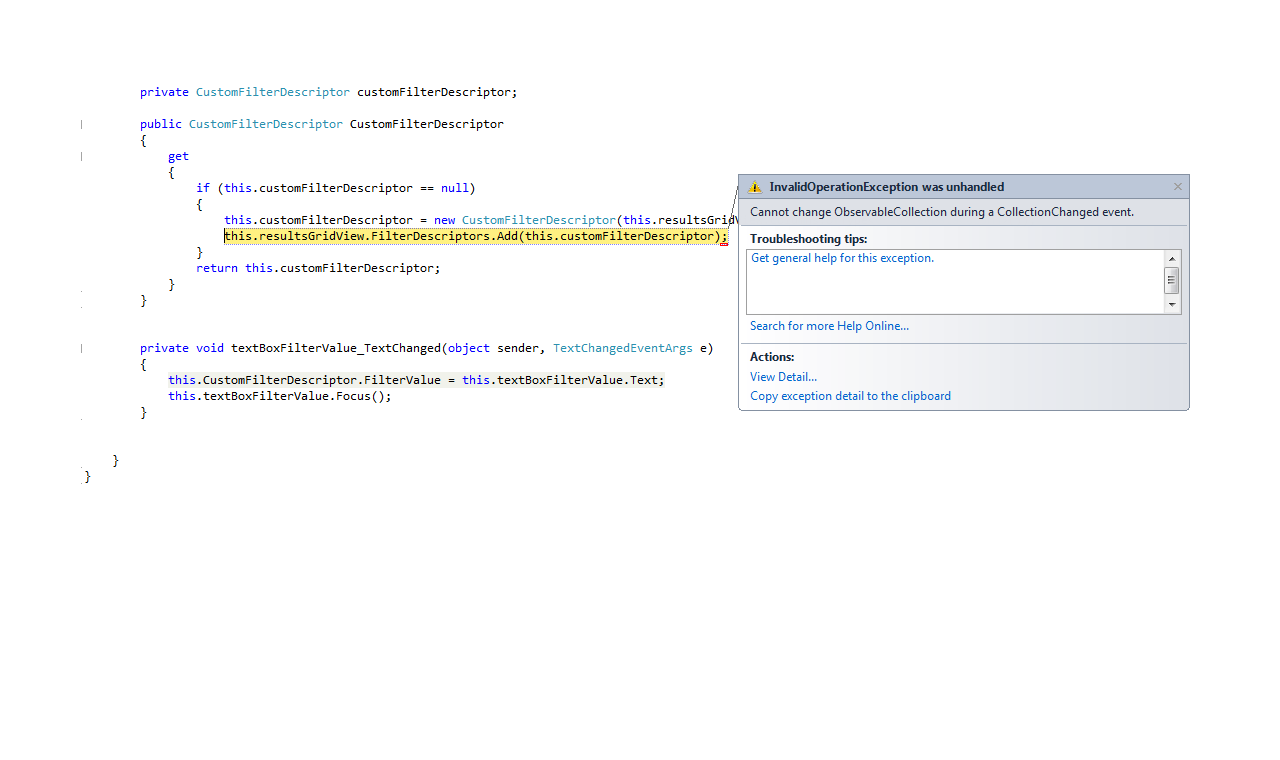 | uxRad4GridView.SelectionChanged += new EventHandler<SelectionChangeEventArgs>(uxRad4GridView_SelectionChanged); // Using this instead of IsSynchronizedWithCurrentItem |