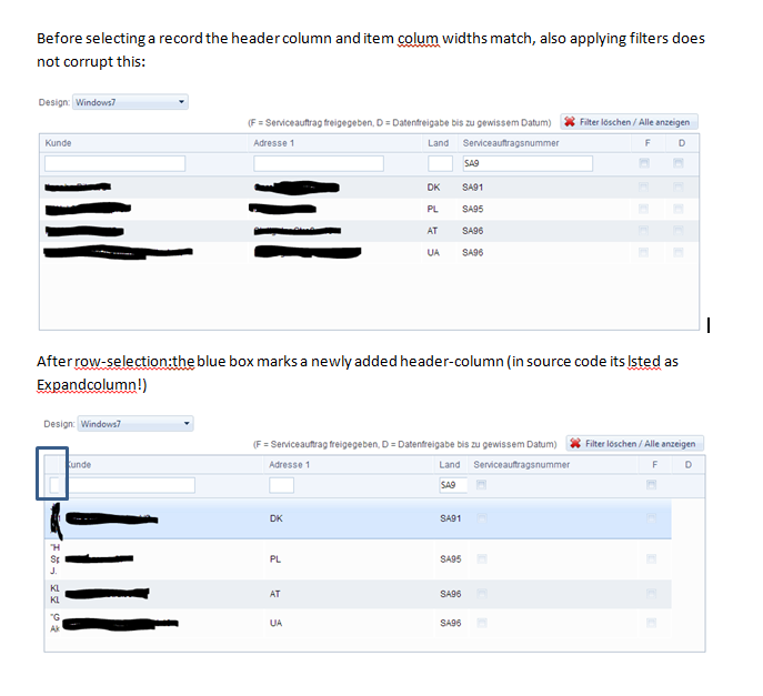 After selecting a row the with of the header and item colums do not match any longer. I think what happens is, is that the header is showing an new "ExpandColumn" whilst the item-part doesnt. Could that be?