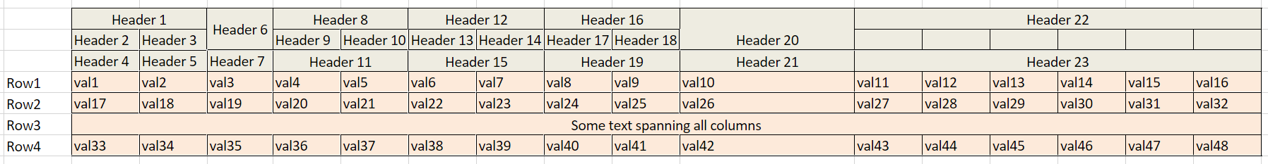 The second problems is with headers. As you can see the table has some multilevel headers. I was able to create some sort of substitution of the presented header with Column Groups, but it's not the same, eg. Header 6 should span 2. The main struggle is that content cells are connected directly to Headers in second row, 3rd row of headers is only for labeling and is not connected to the table content?
