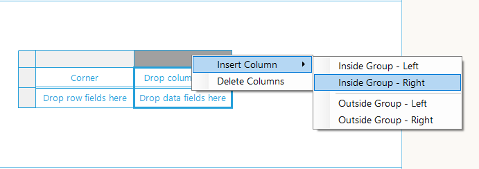 1. Insert a Crosstab table in the report 2. Select the Crosstab table 3. Right-click Column 4. Select Inside Group - Right.