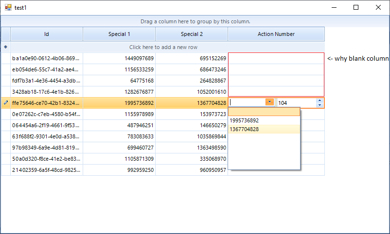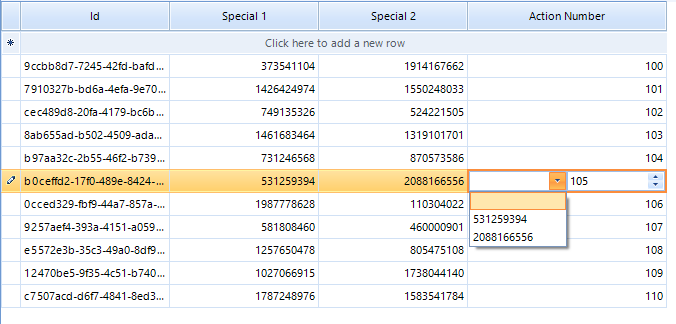 Imports System.ComponentModelImports Telerik.WinControlsImports Telerik.WinControls.UIPublic Class test1 Inherits System.Windows.Forms.Form 'moved designer here for forum post#Region " Designer " 'Form overrides dispose to clean up the component list. <System.Diagnostics.DebuggerNonUserCode()> Protected Overrides Sub Dispose(ByVal disposing As Boolean) Try If disposing AndAlso components IsNot Nothing Then components.Dispose() End If Finally MyBase.Dispose(disposing) End Try End Sub 'Required by the Windows Form Designer Private components As System.ComponentModel.IContainer 'NOTE: The following procedure is required by the Windows Form Designer 'It can be modified using the Windows Form Designer. 'Do not modify it using the code editor. <System.Diagnostics.DebuggerStepThrough()> Private Sub InitializeComponent() Dim GridViewTextBoxColumn1 As Telerik.WinControls.UI.GridViewTextBoxColumn = New Telerik.WinControls.UI.GridViewTextBoxColumn() Dim GridViewDecimalColumn1 As Telerik.WinControls.UI.GridViewDecimalColumn = New Telerik.WinControls.UI.GridViewDecimalColumn() Dim GridViewDecimalColumn2 As Telerik.WinControls.UI.GridViewDecimalColumn = New Telerik.WinControls.UI.GridViewDecimalColumn() Dim GridViewDecimalColumn3 As DropdownandSpinEditorColumn = New DropdownandSpinEditorColumn() Dim TableViewDefinition1 As Telerik.WinControls.UI.TableViewDefinition = New Telerik.WinControls.UI.TableViewDefinition() Me.RadGridView1 = New Telerik.WinControls.UI.RadGridView() CType(Me.RadGridView1, System.ComponentModel.ISupportInitialize).BeginInit() CType(Me.RadGridView1.MasterTemplate, System.ComponentModel.ISupportInitialize).BeginInit() Me.SuspendLayout() ' 'RadGridView1 ' Me.RadGridView1.Dock = System.Windows.Forms.DockStyle.Fill Me.RadGridView1.Location = New System.Drawing.Point(0, 0) ' ' ' GridViewTextBoxColumn1.FieldName = "Id" GridViewTextBoxColumn1.HeaderText = "Id" GridViewTextBoxColumn1.Name = "Id" GridViewTextBoxColumn1.Width = 150 GridViewDecimalColumn1.DecimalPlaces = 0 GridViewDecimalColumn1.FieldName = "SpecialNumber1" GridViewDecimalColumn1.HeaderText = "Special 1" GridViewDecimalColumn1.Name = "SpecialNumber1" GridViewDecimalColumn1.Width = 150 GridViewDecimalColumn2.DecimalPlaces = 0 GridViewDecimalColumn2.FieldName = "SpecialNumber2" GridViewDecimalColumn2.HeaderText = "Special 2" GridViewDecimalColumn2.Name = "SpecialNumber2" GridViewDecimalColumn2.Width = 150 GridViewDecimalColumn3.DecimalPlaces = 0 GridViewDecimalColumn3.FieldName = "ActionNumber" GridViewDecimalColumn3.HeaderText = "Action Number" GridViewDecimalColumn3.Name = "ActionNumber" GridViewDecimalColumn3.Width = 200 Me.RadGridView1.MasterTemplate.Columns.AddRange(New Telerik.WinControls.UI.GridViewDataColumn() {GridViewTextBoxColumn1, GridViewDecimalColumn1, GridViewDecimalColumn2, GridViewDecimalColumn3}) Me.RadGridView1.MasterTemplate.ViewDefinition = TableViewDefinition1 Me.RadGridView1.Name = "RadGridView1" Me.RadGridView1.Size = New System.Drawing.Size(800, 450) Me.RadGridView1.TabIndex = 0 ' 'test1 ' Me.AutoScaleDimensions = New System.Drawing.SizeF(6.0!, 13.0!) Me.AutoScaleMode = System.Windows.Forms.AutoScaleMode.Font Me.ClientSize = New System.Drawing.Size(800, 450) Me.Controls.Add(Me.RadGridView1) Me.Name = "test1" Me.Text = "test1" CType(Me.RadGridView1.MasterTemplate, System.ComponentModel.ISupportInitialize).EndInit() CType(Me.RadGridView1, System.ComponentModel.ISupportInitialize).EndInit() Me.ResumeLayout(False) End Sub Friend WithEvents RadGridView1 As Telerik.WinControls.UI.RadGridView#End Region Private _list As New BindingList(Of GenData) Private Sub test1_Load(sender As Object, e As EventArgs) Handles Me.Load Dim r As New Random(Now.Millisecond) For i = 100 To 110 _list.Add(New GenData(r) With {.ActionNumber = i}) Next Me.RadGridView1.DataSource = _list End Sub Private Sub RadGridView1_CreateCell(sender As Object, e As GridViewCreateCellEventArgs) Handles RadGridView1.CreateCell If TypeOf e.Row.RowInfo Is GridViewDataRowInfo Then Select Case e.Column.Name.ToLower() Case "actionnumber" e.CellElement = New DropdownandSpinEditorCellElement(e.Column, e.Row) e.CellType = GetType(DropdownandSpinEditorCellElement) End Select End If End Sub Private Sub RadGridView1_CellEndEdit(sender As Object, e As GridViewCellEventArgs) Handles RadGridView1.CellEndEdit If TypeOf e.Row Is GridViewDataRowInfo Then Dim elementsToRemove As New List(Of RadElement) Dim d = e.Row.DataBoundItem Console.WriteLine("end edit - " + d.ToString()) Select Case e.Column.Name.ToLower() Case "actionnumber" For Each c In RadGridView1.CurrentCell.Children If TypeOf c Is RadDropDownListElement Then elementsToRemove.Add(c) End If Next For Each i In elementsToRemove RadGridView1.CurrentCell.Children.Remove(i) Console.WriteLine("end edit : removed dropdown") Next End Select End If End Sub Private Sub RadGridView1_CellBeginEdit(sender As Object, e As GridViewCellCancelEventArgs) Handles RadGridView1.CellBeginEdit If TypeOf e.Row Is GridViewDataRowInfo Then Dim d = e.Row.DataBoundItem Console.WriteLine("begin edit - " + d.ToString()) Select Case e.Column.Name.ToLower() Case "actionnumber" CType(RadGridView1.CurrentCell, DropdownandSpinEditorCellElement).DrawEditor(d) End Select End If End SubEnd ClassPublic Class GenData Private _rand As Random Public Sub New() _rand = New Random(Date.Now.Millisecond) SetSpecials() End Sub Public Sub New(rand As Random) _rand = rand SetSpecials() End Sub Public Sub SetSpecials() SpecialNumber1 = _rand.Next() SpecialNumber2 = _rand.Next() End Sub Public Overrides Function ToString() As String Return NameOf(Id) + " - " + Id + ", " + NameOf(ActionNumber) + " - " + ActionNumber.ToString() End Function Public Property Id As String = Guid.NewGuid.ToString Public Property SpecialNumber1 As Integer = -1 Public Property SpecialNumber2 As Integer = -1 Public Property ActionNumber As Integer = -1End ClassPublic Class DropdownandSpinEditorCellElement Inherits GridDataCellElement Private _radDropDownElement As RadDropDownList