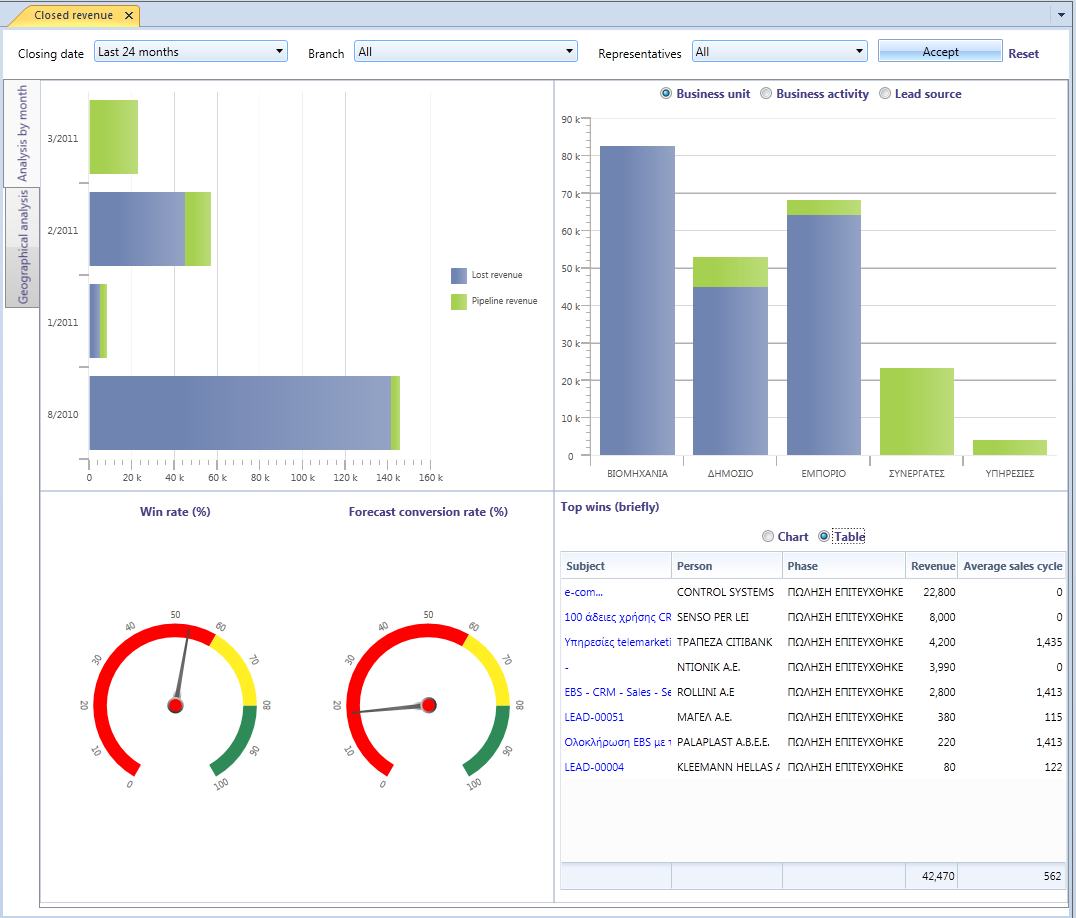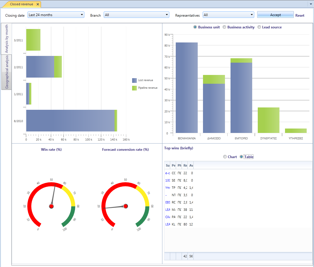 Imports Telerik.Windows.ControlsImports Telerik.Windows.Controls.GridViewImports Telerik.Windows.DataClass MainWindow Private Sub Window_Loaded(sender As System.Object, e As System.Windows.RoutedEventArgs) Me.grid.Columns.AddRange(GridColumns) Me.grid.ItemsSource = TestData() End Sub Private Shared Function GridColumns() As IEnumerable(Of GridViewBoundColumnBase) Return { New GridViewDataColumn With {.UniqueName = "String1", .Header = "Topic", .Width = New GridViewLength(1, GridViewLengthUnitType.Star)}, New GridViewDataColumn With {.UniqueName = "String2", .Header = "Company", .Width = New GridViewLength(1, GridViewLengthUnitType.Star)}, New GridViewDataColumn With {.UniqueName = "String3", .Header = "Phase", .Width = New GridViewLength(1, GridViewLengthUnitType.Auto)}, New GridViewDataColumn With {.UniqueName = "Decimal1", .Header = "Revenue", .Width = New GridViewLength(1, GridViewLengthUnitType.Auto)}, New GridViewDataColumn With {.UniqueName = "Decimal2", .Header = "Sales Cycle", .Width = New GridViewLength(1, GridViewLengthUnitType.Auto)} } End Function Private Shared Function TestData() As IEnumerable(Of DataModelObject) Return { New DataModelObject With {.String1 = "100 CRM licenses", .String2 = "SENSO PER LAY", .String3 = "SALE SUCCESSFULL", .Decimal1 = 8000, .Decimal2 = 0}, New DataModelObject With {.String1 = "e-com...", .String2 = "CONTROL SYSTEMS", .String3 = "SALE SUCCESSFULL", .Decimal1 = 22800, .Decimal2 = 0}, New DataModelObject With {.String1 = "LEAD-00004", .String2 = "KLEEMAN HELLAS", .String3 = "SALE SUCCESSFULL", .Decimal1 = 80, .Decimal2 = 122}, New DataModelObject With {.String1 = "Telemarketing services", .String2 = "CITYBANK", .String3 = "SALE SUCCESSFULL", .Decimal1 = 4200, .Decimal2 = 1435} } End FunctionEnd ClassDataModelObject.vb