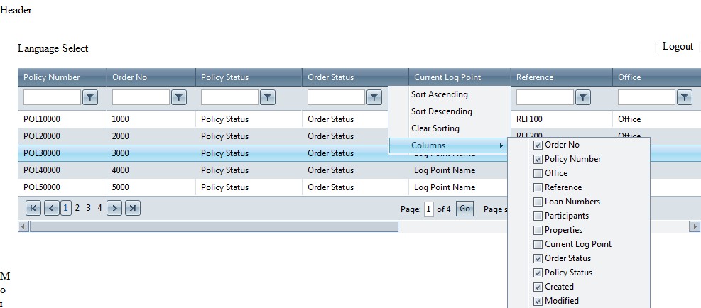 | Policy Number | Order No | Policy Status | Order Status | Current Log point | Reference | Office | Created | Modified |