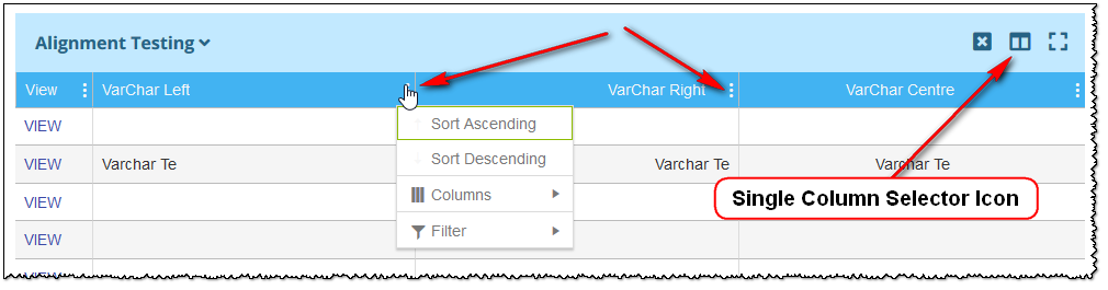 I need to have a grid where I can sort my columns by clicking on the text in the column header, filter a column using the little funnel icon on each column and then have a separate icon outside the grid that pops up the column selector.