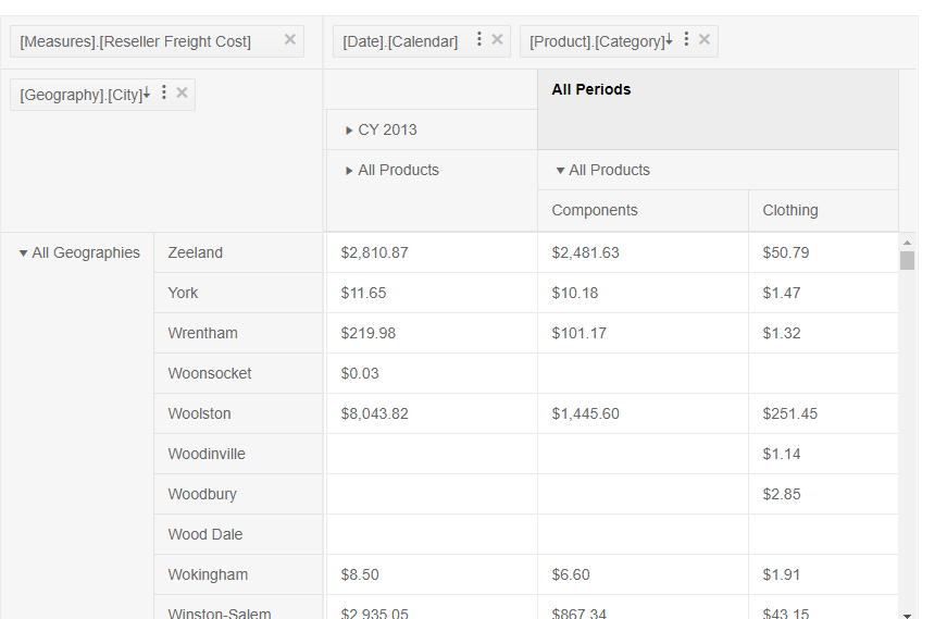 public class TransactionViewModel{ public string Category { get; set; } public string Product { get; set; } public string Country { get; set; } public string State { get; set; } public decimal? Quantity { get; set; } public int CategorySortOrder { get; set; } public int ProductSortOrder { get; set; } public int CountrySortOrder { get; set; } public int StateSortOrder { get; set; } }@(Html.Kendo().PivotGrid<MyProject.Web.ViewModels.TransactionViewModel>() .Name("pivotgrid") .Filterable(true) .ColumnWidth(65) .Height(585) .DataSource(dataSource => dataSource .Ajax() .Transport(transport => transport.Read(read => read.Action("Transaction_Read", "Home").Data("SearchValues"))) .Schema(schema => schema .Cube(cube => cube .Dimensions(dimensions => { dimensions.Add(model => model.Category).Caption("Categories"); dimensions.Add(model => model.Product).Caption("Products"); dimensions.Add(model => model.Country).Caption("Countries"); dimensions.Add(model => model.State).Caption("States"); }) .Measures(measures => measures.Add("Quantity Sum").Field(model => model.Quantity).AggregateName("sum").Format("{0:n2}")) )) .Columns(columns => { columns.Add("Category").Expand(true); columns.Add("Product"); }) .Rows(rows => { rows.Add("Country").Expand(true); rows.Add("State"); }) .Measures(measures => measures.Values("Quantity Sum")) .Sort(sort => { sort.Add("CategorySortOrder").Ascending(); //We have a specific order requirement for them sort.Add("ProductSortOrder").Ascending(); sort.Add("CountrySortOrder").Ascending(); sort.Add("StateSortOrder").Ascending(); } ) ))Hello Grace,