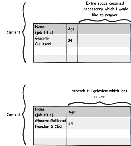 Here I have problem to set width of last column of gridview. My Grid view is Fit to screen and second column cosume the space according to the content. Actually I need to set column stretch till gridview.