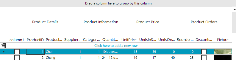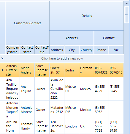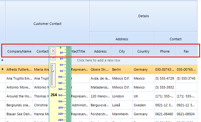 ColumnGroupsViewDefinition view = new ColumnGroupsViewDefinition();view.ColumnGroups.Add(new GridViewColumnGroup("Customer Contact"));view.ColumnGroups.Add(new GridViewColumnGroup("Details"));view.ColumnGroups[1].Groups.Add(new GridViewColumnGroup("Address"));view.ColumnGroups[1].Groups.Add(new GridViewColumnGroup("Contact"));view.ColumnGroups[0].Rows.Add(new GridViewColumnGroupRow());view.ColumnGroups[0].Rows[0].ColumnNames.Add("CompanyName");view.ColumnGroups[0].Rows[0].ColumnNames.Add("ContactName");view.ColumnGroups[0].Rows[0].ColumnNames.Add("ContactTitle");view.ColumnGroups[1].Groups[0].Rows.Add(new GridViewColumnGroupRow());view.ColumnGroups[1].Groups[0].Rows[0].ColumnNames.Add("Address");view.ColumnGroups[1].Groups[0].Rows[0].ColumnNames.Add("City");view.ColumnGroups[1].Groups[0].Rows[0].ColumnNames.Add("Country");view.ColumnGroups[1].Groups[1].Rows.Add(new GridViewColumnGroupRow());view.ColumnGroups[1].Groups[1].Rows[0].ColumnNames.Add("Phone");view.ColumnGroups[1].Groups[1].Rows[0].ColumnNames.Add("Fax");view.ColumnGroups[1].RowSpan = 100;view.ColumnGroups[1].Groups[0].RowSpan = 50;radGridView1.ViewDefinition = view;I hope this information helps. If you have any additional questions, please let me know.