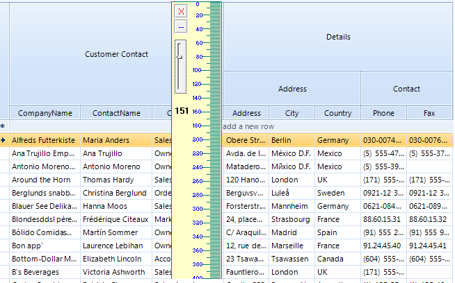 public RadForm1(){ InitializeComponent(); this.radGridView1.CreateRow += radGridView1_CreateRow; foreach (GridViewColumn col in this.radGridView1.Columns) { col.WrapText = true; }}private void radGridView1_CreateRow(object sender, GridViewCreateRowEventArgs e){ if (e.RowType == typeof(GridDataRowElement)) { e.RowType = typeof(CustomRowElement); }}private void RadForm1_Load(object sender, EventArgs e){ this.customersTableAdapter.Fill(this.nwindDataSet.Customers); ColumnGroupsViewDefinition view = new ColumnGroupsViewDefinition(); view.ColumnGroups.Add(new GridViewColumnGroup("Customer Contact")); view.ColumnGroups.Add(new GridViewColumnGroup("Details")); view.ColumnGroups[1].Groups.Add(new GridViewColumnGroup("Address")); view.ColumnGroups[1].Groups.Add(new GridViewColumnGroup("Contact")); view.ColumnGroups[0].Rows.Add(new GridViewColumnGroupRow()); view.ColumnGroups[0].Rows[0].ColumnNames.Add("CompanyName"); view.ColumnGroups[0].Rows[0].ColumnNames.Add("ContactName"); view.ColumnGroups[0].Rows[0].ColumnNames.Add("ContactTitle"); view.ColumnGroups[1].Groups[0].Rows.Add(new GridViewColumnGroupRow()); view.ColumnGroups[1].Groups[0].Rows[0].ColumnNames.Add("Address"); view.ColumnGroups[1].Groups[0].Rows[0].ColumnNames.Add("City"); view.ColumnGroups[1].Groups[0].Rows[0].ColumnNames.Add("Country"); view.ColumnGroups[1].Groups[1].Rows.Add(new GridViewColumnGroupRow()); view.ColumnGroups[1].Groups[1].Rows[0].ColumnNames.Add("Phone"); view.ColumnGroups[1].Groups[1].Rows[0].ColumnNames.Add("Fax"); view.ColumnGroups[1].RowSpan = 100; view.ColumnGroups[1].Groups[0].RowSpan = 50; view.ColumnGroups[0].Rows[0].MinHeight = 30; radGridView1.ViewDefinition = view; }public class CustomRowElement : GridDataRowElement{ protected override Type ThemeEffectiveType { get { return typeof(GridDataRowElement); } } protected override SizeF MeasureOverride(SizeF availableSize) { SizeF baseSize = base.MeasureOverride(availableSize); CellElementProvider provider = new CellElementProvider(this.TableElement); SizeF desiredSize = SizeF.Empty; foreach (GridViewColumn column in this.ViewTemplate.Columns) { if (!this.IsColumnVisible(column)) { continue; } GridDataCellElement cellElement = provider.GetElement(column, this) as GridDataCellElement; this.Children.Add(cellElement); if (cellElement != null) { cellElement.Measure(new SizeF(column.Width, float.PositiveInfinity)); if (desiredSize.Height < cellElement.DesiredSize.Height) { desiredSize.Height = cellElement.DesiredSize.Height; } } cellElement.Detach(); this.Children.Remove(cellElement); } SizeF elementSize = this.TableElement.RowScroller.ElementProvider.GetElementSize(this.RowInfo); int oldHeight = RowInfo.Height == -1 ? (int)elementSize.Height : RowInfo.Height; this.RowInfo.SuspendPropertyNotifications(); this.RowInfo.Height = (int)desiredSize.Height; this.RowInfo.ResumePropertyNotifications(); if (!this.RowInfo.IsPinned) { int delta = RowInfo.Height - oldHeight; TableElement.RowScroller.UpdateScrollRange(TableElement.RowScroller.Scrollbar.Maximum + delta, false); } baseSize.Height = this.RowInfo.Height; return baseSize; } private bool IsColumnVisible(GridViewColumn column) { return column.IsVisible; }}I hope this information helps. If you have any additional questions, please let me know.