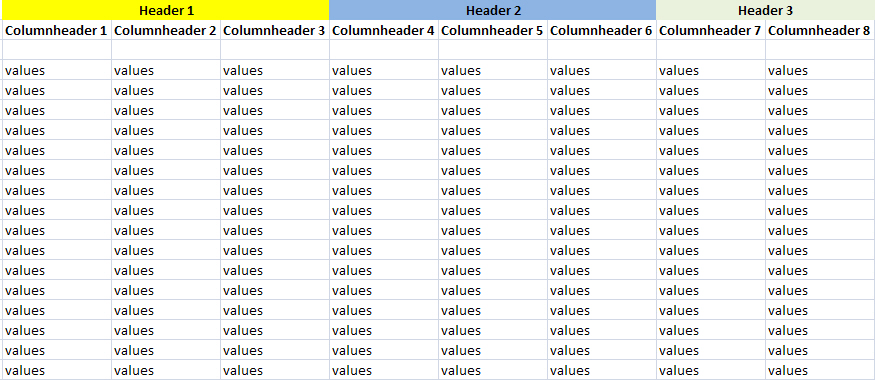 I'have got some columns which should have two rows of columnheaders. The first line of the columnheader contains a summary (rubric) and should be centered. The captions of the columns should follow in the next line.