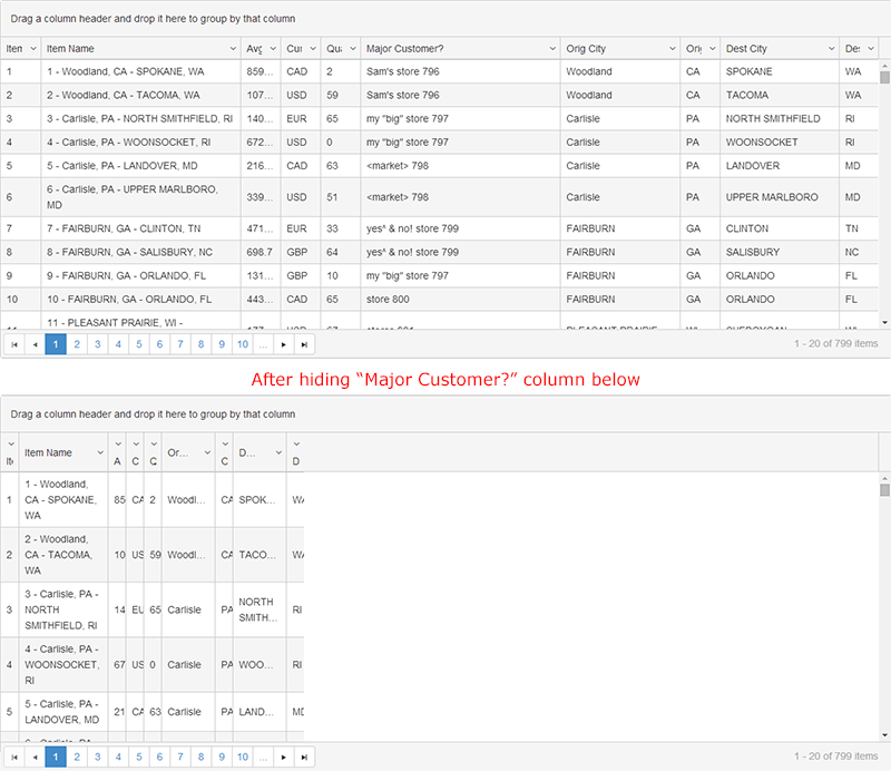 columns: [{ field: "items__item", title: "Item Id", width: 25 }, { field: "items__name", title: "Item Name", width: 125 }, { field: "items__average_historic_price", title: "Avg Hist Price", width: 25 }, { field: "items__price_currency", title: "Currency", width: 25 }, { field: "items__quantity", title: "Quantity", width: 25 }, { field: "attribute79_value", title: "Major Customer?", width: 125 }, { field: "attribute84_value", title: "Orig City", width: 75 }, { field: "attribute85_value", title: "Orig State", width: 25 }, { field: "attribute89_value", title: "Dest City", width: 75 }, { field: "attribute90_value", title: "Dest State", width: 25 }]The grid renders fine. I have columnMenu set to true. When I go to any column menu and deselect a checkbox in the Columns section, that column is hidden as expected but all the remaining columns shrink and collapse to the left (see attached).