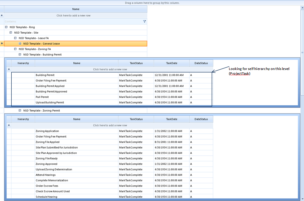 "ProjectContract.TemplateContracts" is ProjectTemplate Collection and"ProjectContract.TaskContracts" is ProjectTask Collection.radGridView1.MasterTemplate.DataSource = ProjectContract.TemplateContracts;radGridView1.MasterTemplate.Templates.Add(new GridViewTemplate() { DataSource = ProjectContract.TaskContracts });radGridView1.Relations.AddSelfReference(radGridView1.MasterTemplate, "ProjectTemplateId", "ParentProjectTemplateId");radGridView1.Relations.AddSelfReference(radGridView1.MasterTemplate.Templates[0], "ProjectTaskId", "ParentProjectTaskId");var relation = new GridViewRelation(radGridView1.MasterTemplate, radGridView1.MasterTemplate.Templates[0]) { RelationName = "TemplateTask" };relation.ParentColumnNames.Add("ProjectTemplateId");relation.ChildColumnNames.Add("ParentProjectTemplateId");radGridView1.Relations.Add(relation);I am getting somewhat desirable result. I am getting self hierarchy of ProjectTemplate and relation of template and task. But i am unable to get self hierarchy of Project Task.