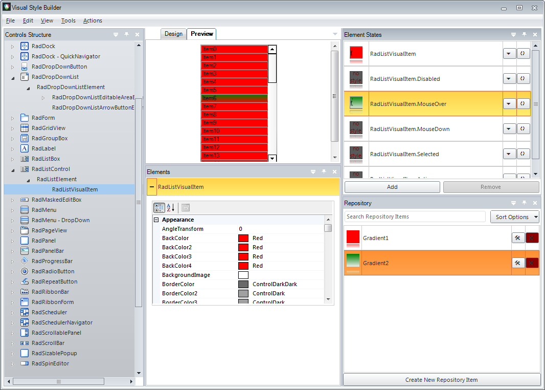 Also i do not see a way to apply themes to the dropdown pane(i think it is the popup) from the visual style builder. Please let me know if i am wrong. And the dropdown item does not seem to have the mouse hover theme when i customized the RadListVisualItem and added a panel. Please suggest me if this the by design or am i doing anything wrong. This one thing is holding up our release.