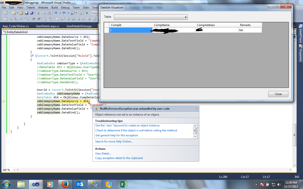 but inside if condition only one combo fills up and it gives same error for second combo though the data can be seen in datatable.