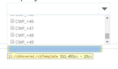 Input = new RadComboBox { ID = "input_" + param.Name, EnableEmbeddedSkins = false, Skin = "Tabbed", AutoPostBack = true, Width = new Unit (100,UnitType.Percentage), Height = new Unit(100, UnitType.Percentage), DropDownCssClass = "Ellipsis", CssClass = "FullLength", MaxHeight = new Unit(220, UnitType.Pixel), CheckBoxes = Multiselect, EnableCheckAllItemsCheckBox = Multiselect //,ItemTemplate = CreateItemTemplate() }; Input.Style.Add ("margin-top", "5px"); Input.Style.Add ("margin-bottom", "5px"); if (!Multiselect) Input.SelectedIndexChanged += new RadComboBoxSelectedIndexChangedEventHandler(input_SelectedIndexChanged); else { Input.ItemChecked += new RadComboBoxItemEventHandler(Input_ItemChecked); Input.CheckAllCheck += new RadComboBoxCheckAllCheckEventHandler(Input_CheckAllCheck); }