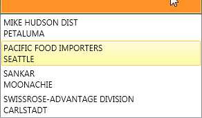 <DataTemplate x:Key="CustomerComboCollapsed"> <TextBlock Text="{Binding CompanyName}" /></DataTemplate><DataTemplate x:Key="CustomerComboExpanded"> <StackPanel> <TextBlock Text="{Binding CompanyName}" /> <TextBlock Text="{Binding CityState}" /> </StackPanel></DataTemplate>Here is the template selector class: