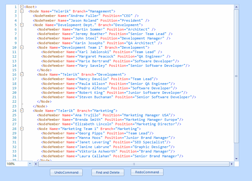 The following example demonstrates how to select and delete the occurrence of the "Telerik" word from the loaded text in the code-behind together with undo and redo buttons: