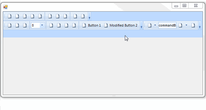 protected override void OnLoad(EventArgs e){ base.OnLoad(e); radCommandBarToggleButtonItem9.Text = "Modified Button 2"; commandBarStripElement2.DesiredLocation = commandBarStripElement2.Location; this.radCommandBarLineElement1.Strips.Remove(this.commandBarStripElement2); this.radCommandBarLineElement2.Strips.Add(this.commandBarStripElement2);}I hope this information helps. If you have any additional questions, please let me know.