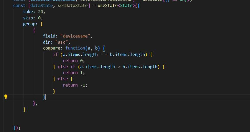 I'm having an issue when I add a "compare" function in the "group" field of the "State"(which take Array<GroupDescriptor> ).