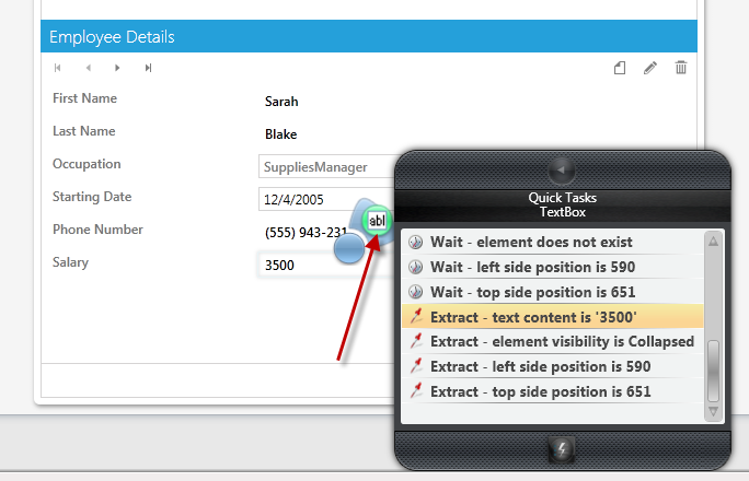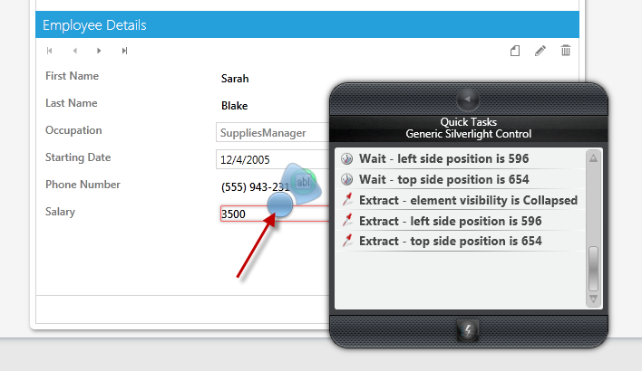 That article was written against an HTML site, so a Silverlight extraction will be slightly different. For a Generic Silverlight Control, don't click the first blue nub (see screen shot 1), which targets the base element. Instead click one of the next nubs that targets to the TextBox, TextBlock, or whatever element holds the text (see screen shot 2).