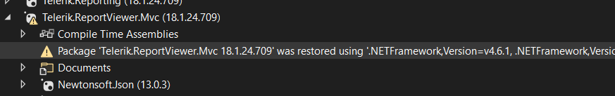 "Package 'Telerik.ReportViewer.Mvc 18.1.24.709' was restored using '.NETFramework,Version=v4.6.1, .NETFramework,Version=v4.6.2, .NETFramework,Version=v4.7, .NETFramework,Version=v4.7.1, .NETFramework,Version=v4.7.2, .NETFramework,Version=v4.8, .NETFramework,Version=v4.8.1' instead of the project target framework 'net8.0'. This package may not be fully compatible with your project."