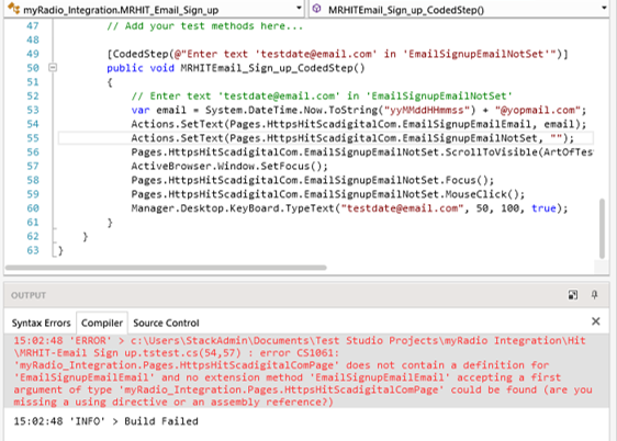 I have added a coded step to one of my tests and on trying to execute it, it throws some compiler error. (attached).