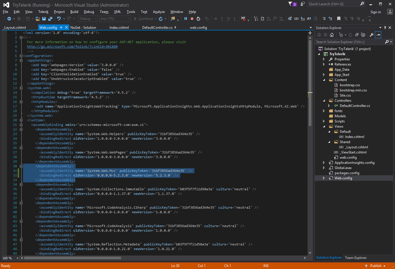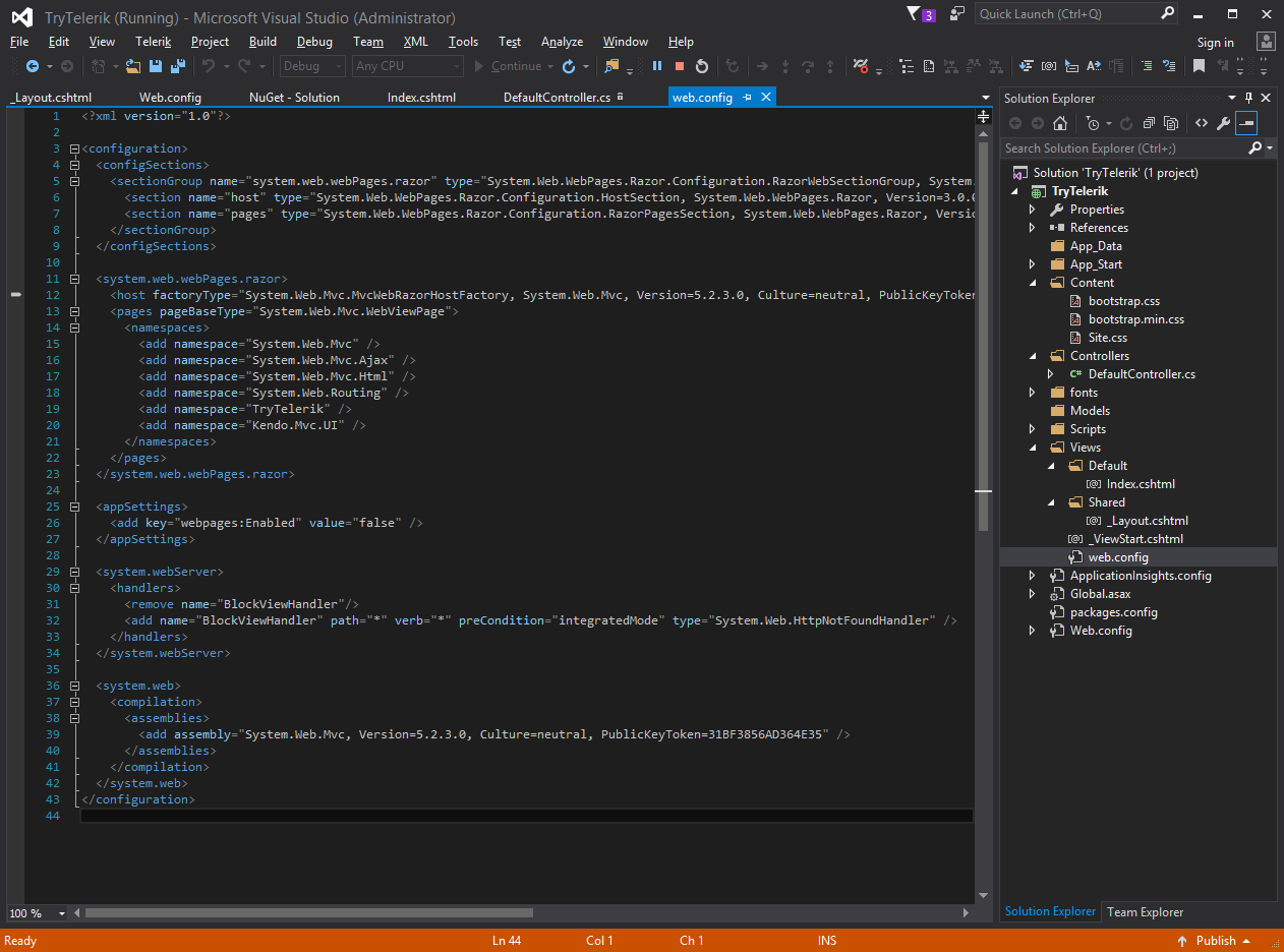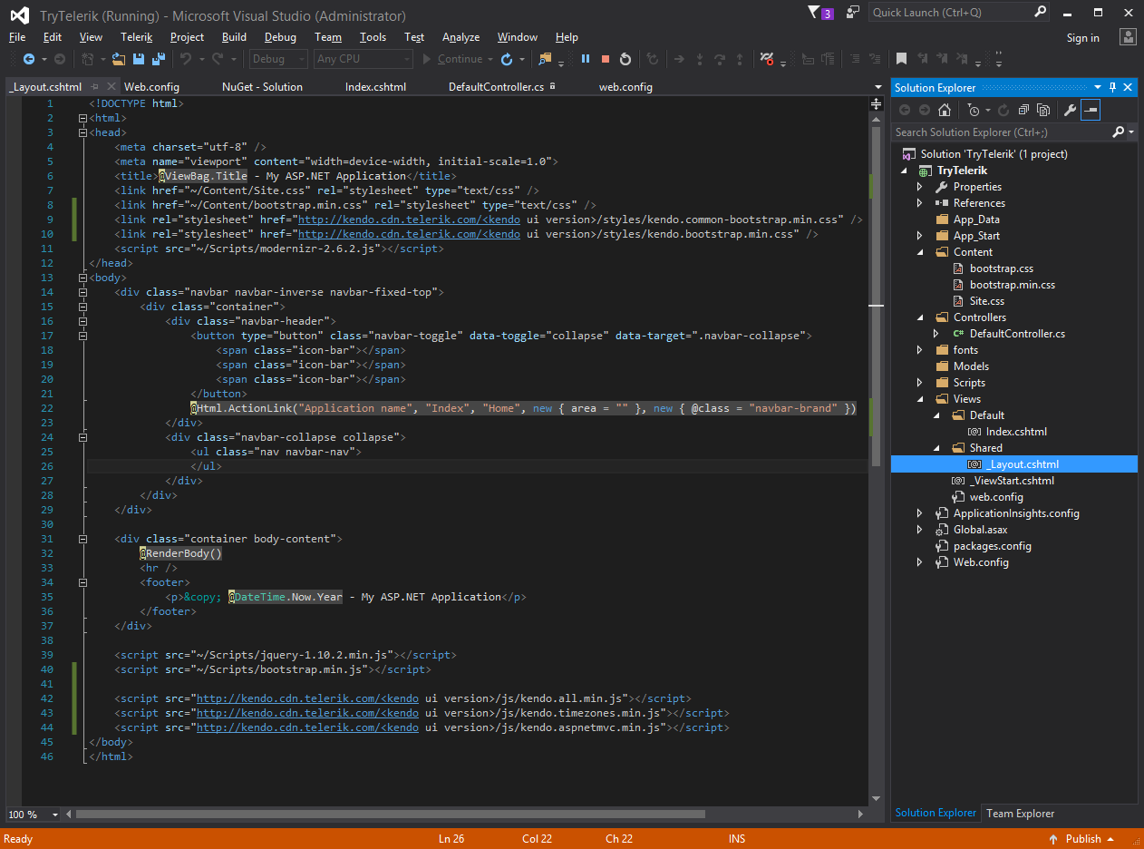 Server Error in '/' Application.Compilation ErrorDescription: An error occurred during the compilation of a resource required to service this request. Please review the following specific error details and modify your source code appropriately. Compiler Error Message: CS1061: 'HtmlHelper<dynamic>' does not contain a definition for 'Kendo' and no extension method 'Kendo' accepting a first argument of type 'HtmlHelper<dynamic>' could be found (are you missing a using directive or an assembly reference?)Source Error:Line 1: @(Html.Kendo().DatePicker().Name("datepicker"))Line 2: Source File: c:\users\navin.choubey\documents\visual studio 2015\Projects\TryTelerik\TryTelerik\Views\Default\Index.cshtml Line: 1 Show Detailed Compiler Output:C:\Program Files (x86)\IIS Express>c:\users\navin.choubey\documents\visual studio 2015\Projects\TryTelerik\TryTelerik\bin\roslyn\csc.exe /t:library /utf8output /nostdlib+ /R:"C:\Windows\Microsoft.NET\Framework\v4.0.30319\mscorlib.dll" /R:"C:\Windows\Microsoft.Net\assembly\GAC_MSIL\System.Runtime\v4.0_4.0.0.0__b03f5f7f11d50a3a\System.Runtime.dll" /R:"C:\Windows\Microsoft.NET\Framework\v4.0.30319\Temporary ASP.NET Files\root\edd7f2e4\a4f5c36c\assembly\dl3\f1791cfc\00fedeb6_12ccd101\Microsoft.AspNetCore.Diagnostics.Abstractions.dll" /R:"C:\Windows\Microsoft.Net\assembly\GAC_MSIL\System\v4.0_4.0.0.0__b77a5c561934e089\System.dll" /R:"C:\Windows\Microsoft.NET\Framework\v4.0.30319\Temporary ASP.NET Files\root\edd7f2e4\a4f5c36c\assembly\dl3\92247743\0067245d_74c5d101\Newtonsoft.Json.dll" /R:"C:\Windows\Microsoft.NET\Framework\v4.0.30319\Temporary ASP.NET Files\root\edd7f2e4\a4f5c36c\assembly\dl3\90044040\00fedeb6_12ccd101\Microsoft.AspNetCore.DataProtection.Abstractions.dll" /R:"C:\Windows\Microsoft.Net\assembly\GAC_MSIL\System.Xml.Linq\v4.0_4.0.0.0__b77a5c561934e089\System.Xml.Linq.dll" /R:"C:\Windows\Microsoft.NET\Framework\v4.0.30319\Temporary ASP.NET Files\root\edd7f2e4\a4f5c36c\assembly\dl3\d2c50e18\00fedeb6_12ccd101\Microsoft.AspNetCore.Http.Abstractions.dll" /R:"C:\Windows\Microsoft.NET\Framework\v4.0.30319\Temporary ASP.NET Files\root\edd7f2e4\a4f5c36c\assembly\dl3\19f209ab\00fedeb6_12ccd101\Microsoft.AspNetCore.Http.Extensions.dll" /R:"C:\Windows\Microsoft.NET\Framework\v4.0.30319\Temporary ASP.NET Files\root\edd7f2e4\a4f5c36c\assembly\dl3\0eba250e\005841b9_12ccd101\Microsoft.Extensions.Caching.Memory.dll" /R:"C:\Windows\Microsoft.Net\assembly\GAC_MSIL\System.ServiceModel.Web\v4.0_4.0.0.0__31bf3856ad364e35\System.ServiceModel.Web.dll" /R:"C:\Windows\Microsoft.NET\Framework\v4.0.30319\Temporary ASP.NET Files\root\edd7f2e4\a4f5c36c\assembly\dl3\5455a925\002b10b8_12ccd101\Microsoft.AspNetCore.Mvc.Formatters.Xml.dll" /R:"C:\Windows\Microsoft.NET\Framework\v4.0.30319\Temporary ASP.NET Files\root\edd7f2e4\a4f5c36c\assembly\dl3\e3833175\005841b9_12ccd101\Microsoft.Extensions.DependencyInjection.Abstractions.dll" /R:"C:\Windows\Microsoft.NET\Framework\v4.0.30319\Temporary ASP.NET Files\root\edd7f2e4\a4f5c36c\assembly\dl3\c97f9c34\005841b9_12ccd101\Microsoft.Extensions.FileProviders.Physical.dll" /R:"C:\Windows\Microsoft.NET\Framework\v4.0.30319\Temporary ASP.NET Files\root\edd7f2e4\a4f5c36c\assembly\dl3\a166e5a7\00fedeb6_12ccd101\Microsoft.AspNetCore.JsonPatch.dll" /R:"C:\Windows\Microsoft.Net\assembly\GAC_MSIL\System.Runtime.Serialization\v4.0_4.0.0.0__b77a5c561934e089\System.Runtime.Serialization.dll" /R:"C:\Windows\Microsoft.NET\Framework\v4.0.30319\Temporary ASP.NET Files\root\edd7f2e4\a4f5c36c\assembly\dl3\31213991\00bc6bbe_accbd101\Microsoft.Extensions.DependencyModel.dll" /R:"C:\Windows\Microsoft.Net\assembly\GAC_MSIL\System.ServiceModel.Activation\v4.0_4.0.0.0__31bf3856ad364e35\System.ServiceModel.Activation.dll" /R:"C:\Windows\Microsoft.NET\Framework\v4.0.30319\Temporary ASP.NET Files\root\edd7f2e4\a4f5c36c\assembly\dl3\47b4ad8c\002b10b8_12ccd101\Microsoft.AspNetCore.Razor.Runtime.dll" /R:"C:\Windows\Microsoft.NET\Framework\v4.0.30319\Temporary ASP.NET Files\root\edd7f2e4\a4f5c36c\assembly\dl3\9241f5b5\005841b9_12ccd101\Microsoft.Extensions.Globalization.CultureInfoCache.dll" /R:"C:\Windows\Microsoft.Net\assembly\GAC_32\System.EnterpriseServices\v4.0_4.0.0.0__b03f5f7f11d50a3a\System.EnterpriseServices.dll" /R:"C:\Windows\Microsoft.NET\Framework\v4.0.30319\Temporary ASP.NET Files\root\edd7f2e4\a4f5c36c\assembly\dl3\1761ee9b\00fedeb6_12ccd101\Microsoft.AspNetCore.Cryptography.Internal.dll" /R:"C:\Windows\Microsoft.NET\Framework\v4.0.30319\Temporary ASP.NET Files\root\edd7f2e4\a4f5c36c\assembly\dl3\210bd1b1\002b10b8_12ccd101\Microsoft.AspNetCore.Mvc.ViewFeatures.dll" /R:"C:\Windows\Microsoft.NET\Framework\v4.0.30319\Temporary ASP.NET Files\root\edd7f2e4\a4f5c36c\assembly\dl3\d548f9b8\009fadb9_8bc7d101\Kendo.Mvc.dll" /R:"C:\Windows\Microsoft.NET\Framework\v4.0.30319\Temporary ASP.NET Files\root\edd7f2e4\a4f5c36c\assembly\dl3\e27776e5\002b10b8_12ccd101\Microsoft.AspNetCore.Mvc.Razor.Host.dll" /R:"C:\Windows\Microsoft.Net\assembly\GAC_MSIL\System.Collections.Immutable\v4.0_1.1.37.0__b03f5f7f11d50a3a\System.Collections.Immutable.dll" /R:"C:\Windows\Microsoft.NET\Framework\v4.0.30319\Temporary ASP.NET Files\root\edd7f2e4\a4f5c36c\assembly\dl3\6769c9a2\00a9c4ea_2350d201\Microsoft.AI.WindowsServer.dll" /R:"C:\Windows\Microsoft.NET\Framework\v4.0.30319\Temporary ASP.NET Files\root\edd7f2e4\a4f5c36c\assembly\dl3\ef0793d8\00a37050_533ad001\System.Web.WebPages.Deployment.dll" /R:"C:\Windows\Microsoft.NET\Framework\v4.0.30319\Temporary ASP.NET Files\root\edd7f2e4\a4f5c36c\assembly\dl3\6ff62d98\002b10b8_12ccd101\Microsoft.AspNetCore.Routing.dll" /R:"C:\Windows\Microsoft.NET\Framework\v4.0.30319\Temporary ASP.NET Files\root\edd7f2e4\a4f5c36c\assembly\dl3\a399d9bc\005841b9_12ccd101\Microsoft.Extensions.Localization.Abstractions.dll" /R:"C:\Windows\Microsoft.NET\Framework\v4.0.30319\Temporary ASP.NET Files\root\edd7f2e4\a4f5c36c\assembly\dl3\4702e828\00fedeb6_12ccd101\Microsoft.AspNetCore.Mvc.Cors.dll" /R:"C:\Windows\Microsoft.NET\Framework\v4.0.30319\Temporary ASP.NET Files\