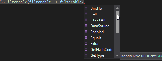 columns.Bound(p => p.UnitsInStock).Width(100).Filterable(f=>f.Cell(c=>c.Template("myFilterCellTemplate")));Detail information on the filter templates could be found in the following help topics for the jQuery widget, applicable for the Core wrapper as well: