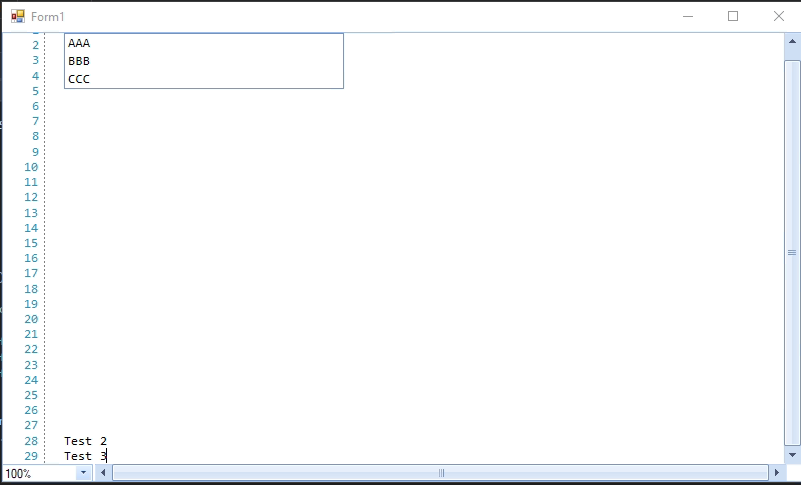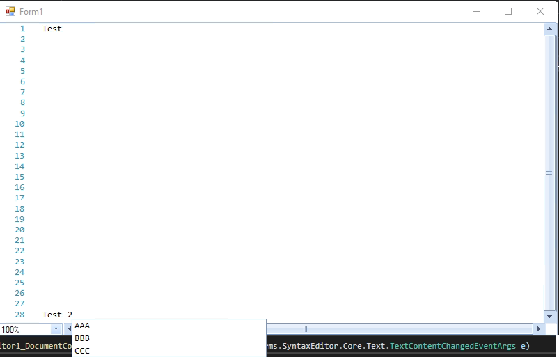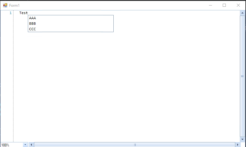 using System.Windows.Forms;using Telerik.WinForms.Controls.SyntaxEditor.UI.IntelliPrompt.Completion;namespace WindowsFormsApp1{ public partial class Form1 : Form { public Form1() { InitializeComponent(); ICompletionInfoCollection completionInfoCollection = new CompletionInfoCollection { new CompletionInfo("AAA", "A description."), new CompletionInfo("BBB", "B description."), new CompletionInfo("CCC", "C description.") }; var completionListWindow = this.radSyntaxEditor1.SyntaxEditorElement.IntelliPrompts.CompletionListWindow; completionListWindow.Presenter.CompletionListItems = completionInfoCollection; } private void radSyntaxEditor1_DocumentContentChanged(object sender, Telerik.WinForms.SyntaxEditor.Core.Text.TextContentChangedEventArgs e) { Telerik.WinForms.Controls.SyntaxEditor.UI.CompletionListPopup completionListWindow = this.radSyntaxEditor1.SyntaxEditorElement.IntelliPrompts.CompletionListWindow; completionListWindow.Show(); completionListWindow.Refresh(); } }}As you can see in the images, in the first two cases everything is ok, but in the third image, when the vertical scroll is not at the start position (moved a little bit), the completion window has a completely wrong place.