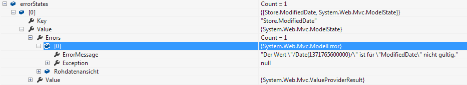 If you alter any values EXCEPT for Shaft Created On, the ModelState will be invalid. I have made it throw an exception showing the AttemptedValue and the Key. It is a JSON value.