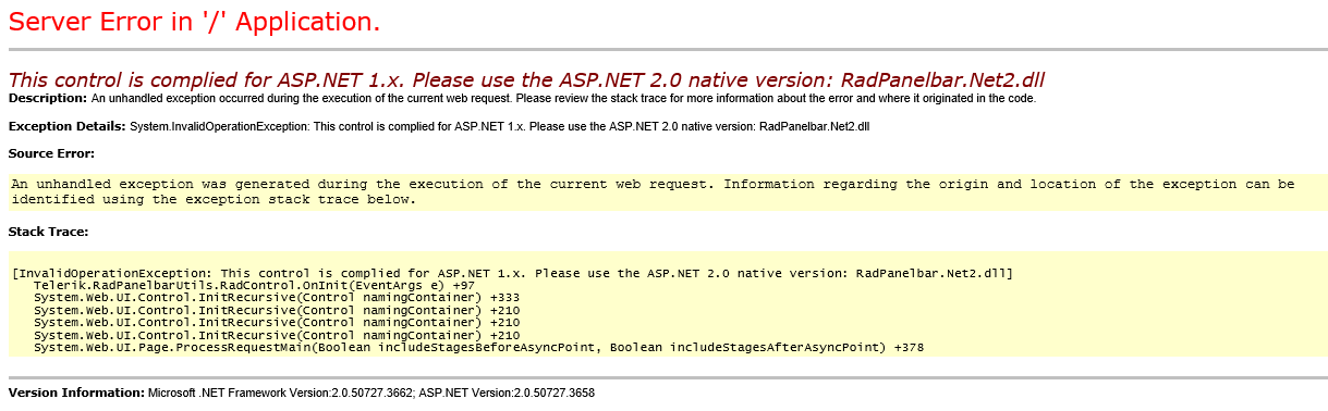 [Solved] Complied for ASP.NET 1.x. Please use the ASP.NET 2.0 native version: RadPanelbar.Net2.dll