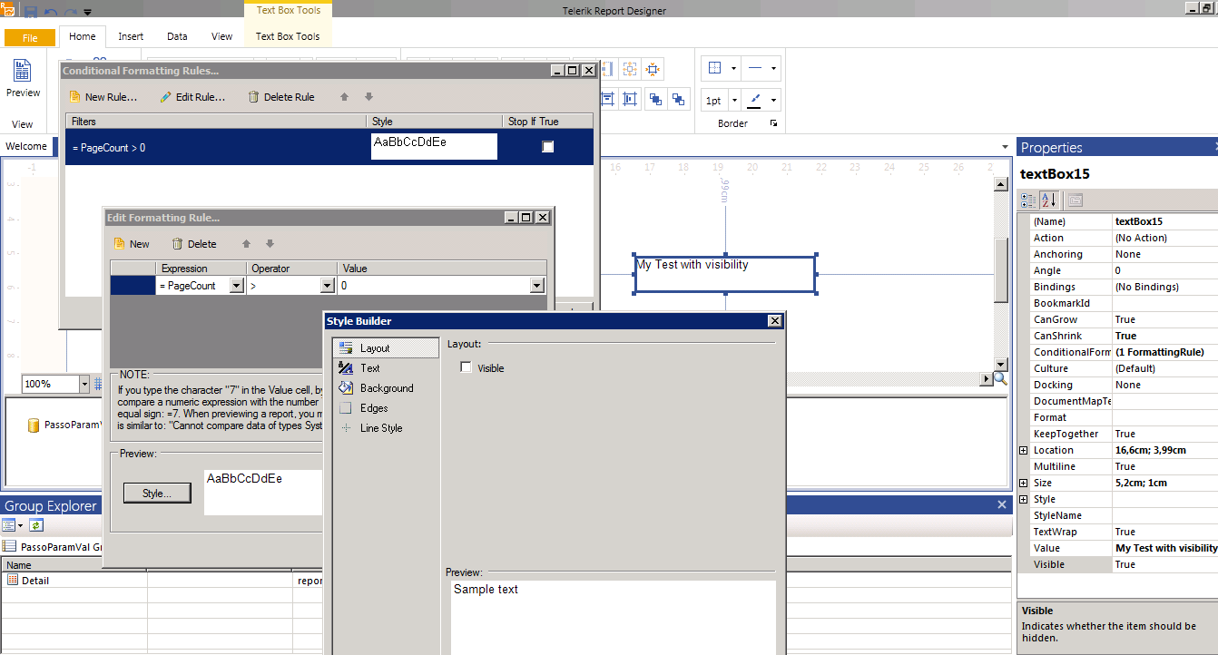 I am having problems with setting the visibility of a report item (a textbox). I set the Visible property of the TextBox to True, and then I defined a Conditional Formatting Rule (PageCount > 0) and un-check the "Visible" checkbox in the Style -> Layout window. This has no effect on my TextBox: it's always visible. I want the Textbox to be invisible if the report has at least one page. (of course, the scenario in my report is much more complex, this is just a simple test to show you I cannot make invisible a simple TextBox in my report). I attach a print screen with details about the above properties on my TextBox.