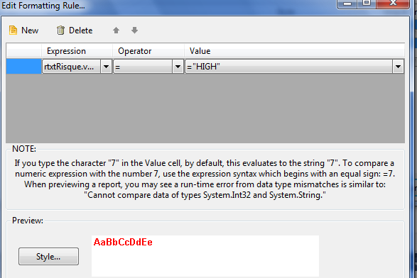 In my code I assign the string "HIGH" to a TextBox in my Report. The report shows the value "HIGH" correctly in the report. I would like to format the TextBox in such a way that the text's colr is Red when it contains "HIGH". Therefore I have created a Conditional Formatting Rule saying that if TextBoxName.Value = ="HIGH" (see attached image) the the style should have a red font color.
