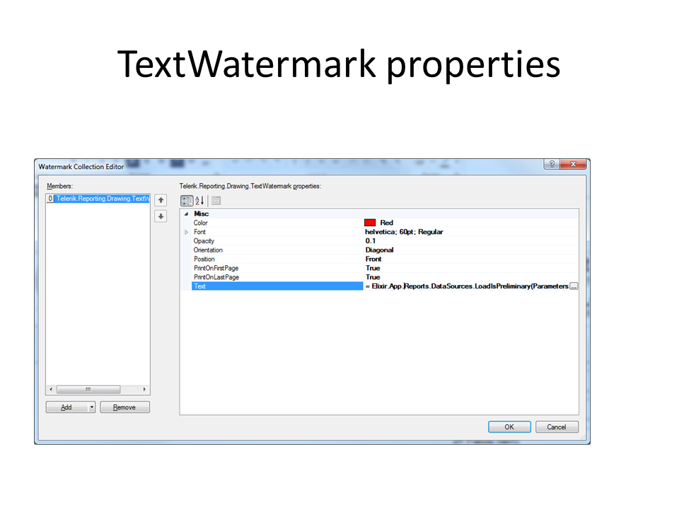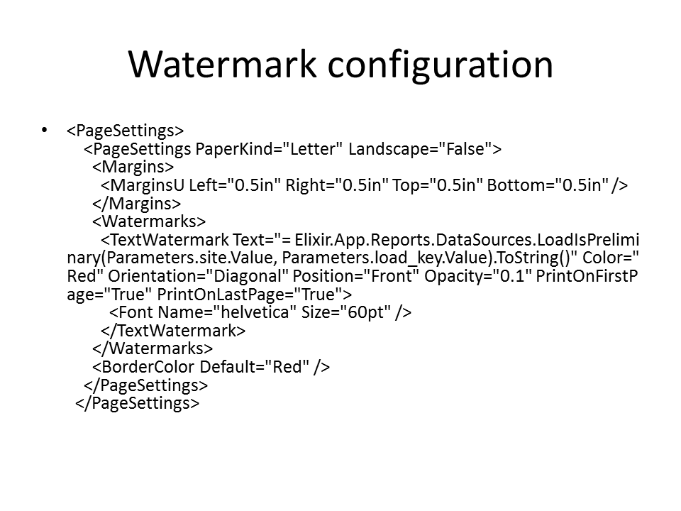 <TextWatermark Text="= Elixir.App.Reports.DataSources.LoadIsPreliminary(Parameters.site.Value, Parameters.load_key.Value).ToString()" Color="Red" Orientation="Diagonal" Position="Front" Opacity="0.1" PrintOnFirstPage="True" PrintOnLastPage="True">