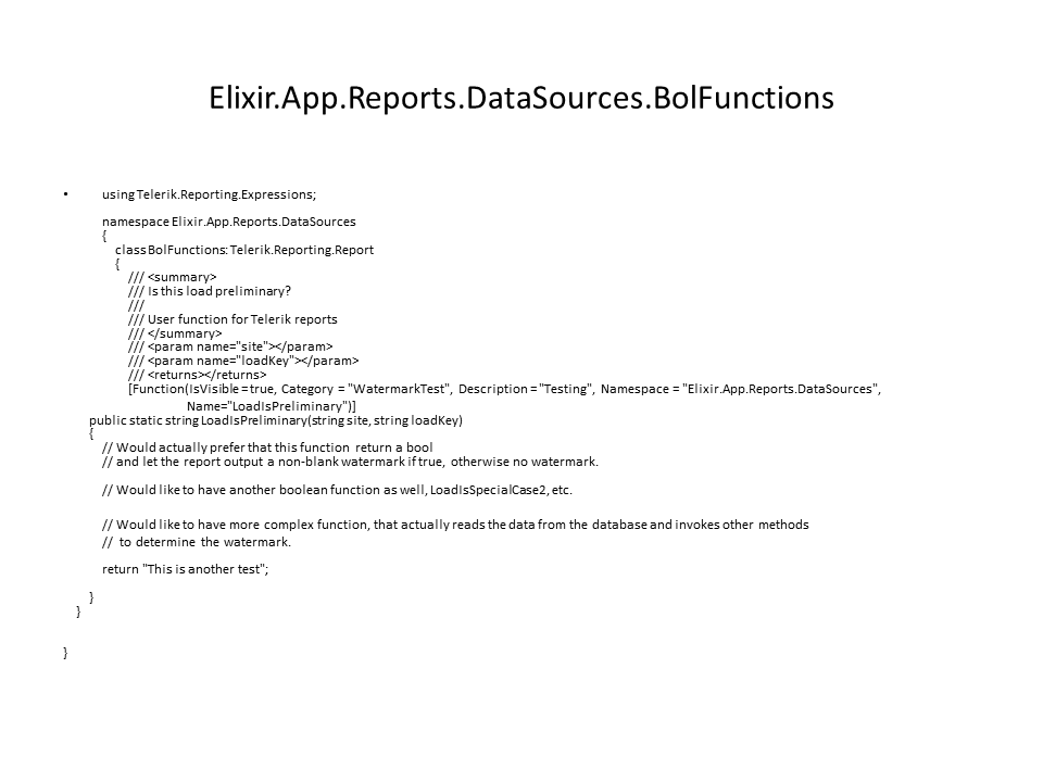 [Function(IsVisible = true, Category = "WatermarkTest", Description = "Testing", Namespace = "Elixir.App.Reports.DataSources", Name="LoadIsPreliminary")]