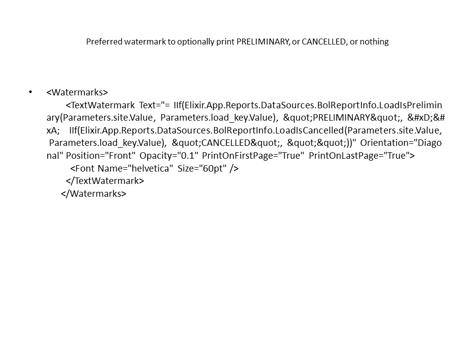 <TextWatermark Text="= IIf(Elixir.App.Reports.DataSources.BolReportInfo.LoadIsPreliminary(Parameters.site.Value, Parameters.load_key.Value), "PRELIMINARY",