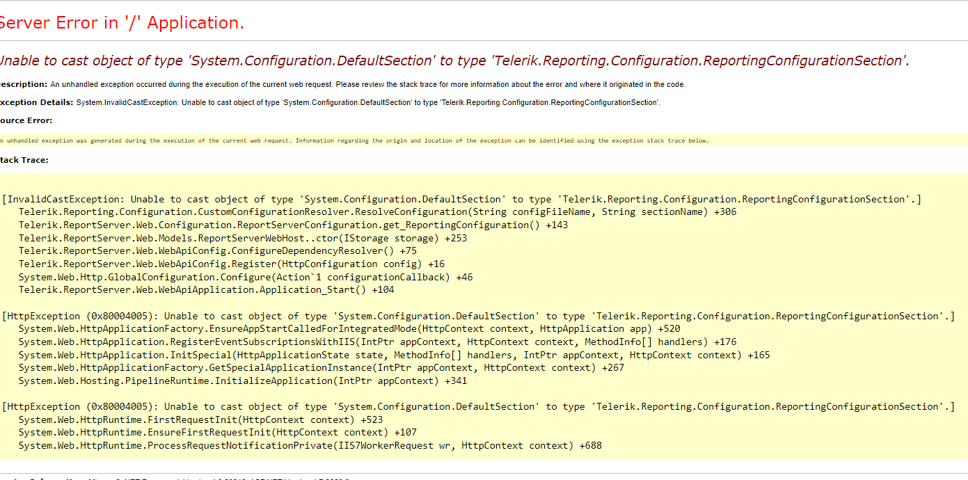 "Unable to cast object of type 'System.Configuration.DefaultSection' to type 'Telerik.Reporting.Configuration.ReportingConfigurationSection'."